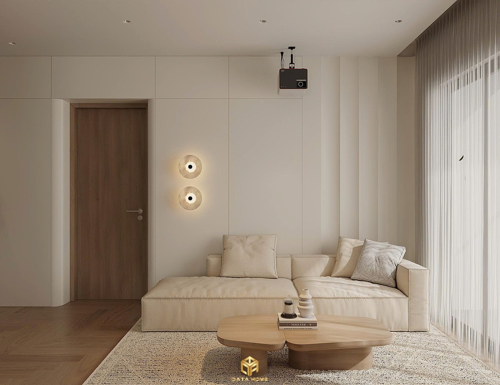 Phòng khách rộng rãi với bàn trà gỗ hình dáng tự nhiên, ghế sofa êm ái và thảm trải sàn nhẹ nhàng. Hệ thống kệ tivi và bàn làm việc tích hợp tạo nên sự liền mạch. Cây xanh được đặt khéo léo, mang đến hơi thở tươi mới cho không gian. Ánh sáng từ cửa sổ lớn và đèn chùm mây trắng lan tỏa khắp phòng, tạo cảm giác ấm áp và mời gọi.