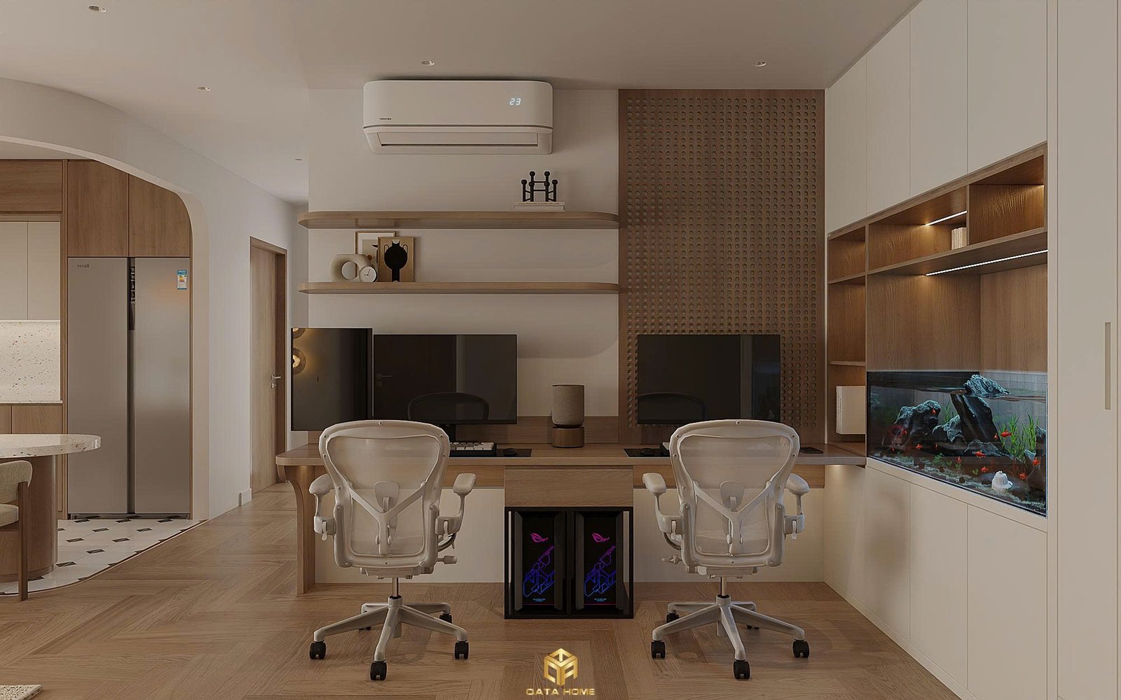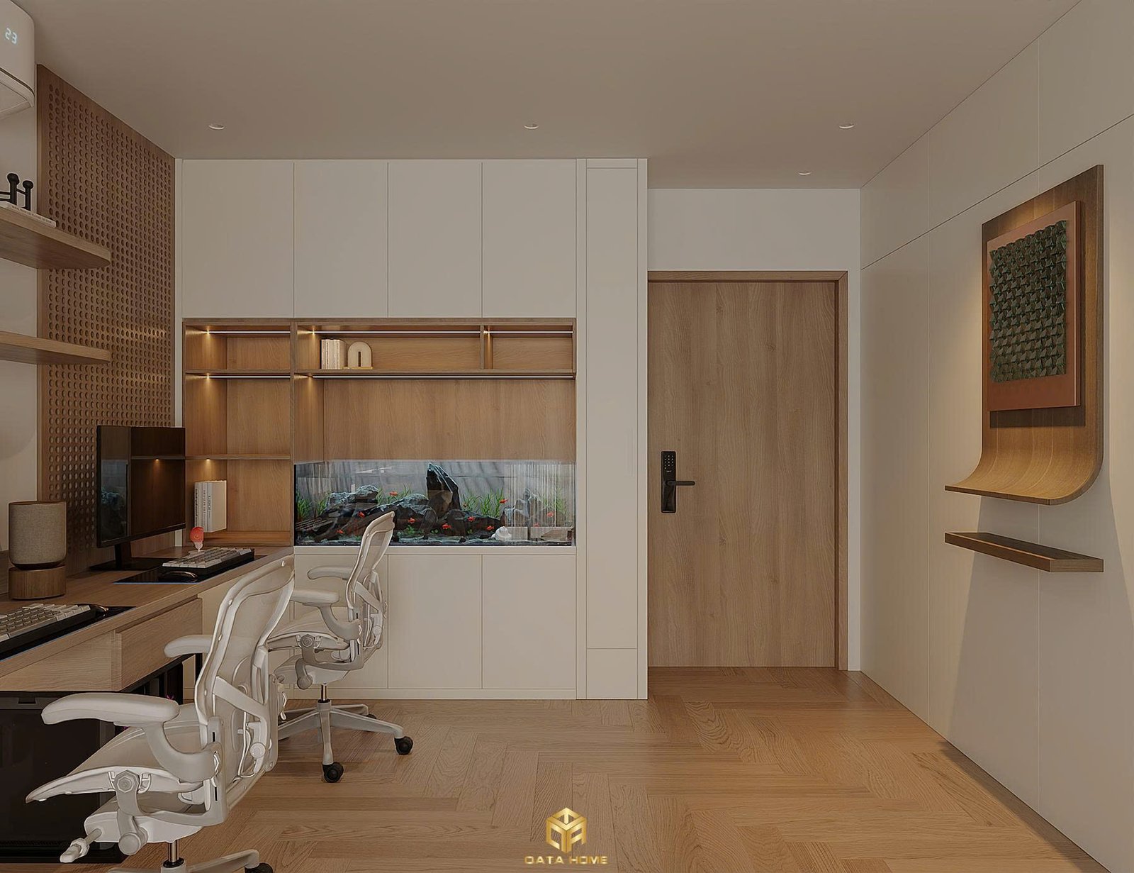 Góc làm việc với bàn gỗ, ghế lưới ergonomics và kệ sách tích hợp giúp tối ưu không gian. Hồ cá cảnh được đặt khéo léo trong tủ kệ tạo điểm nhấn thư giãn. Toàn bộ khu vực này được thiết kế để hỗ trợ công việc và học tập hiệu quả mà vẫn giữ được sự hài hòa với tổng thể căn hộ.