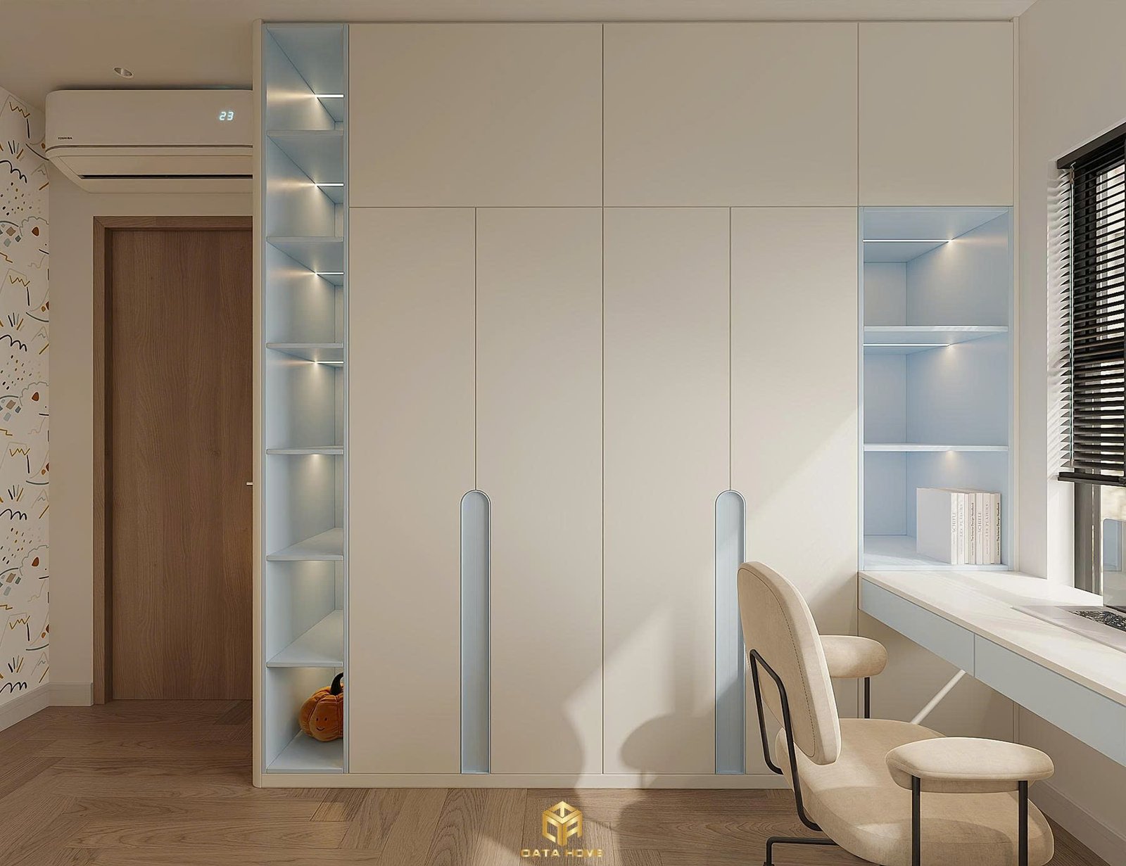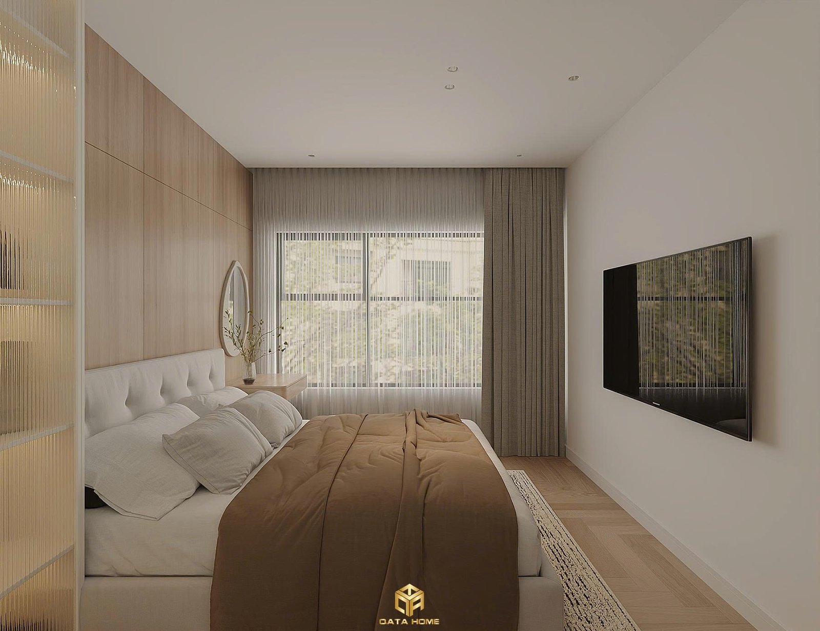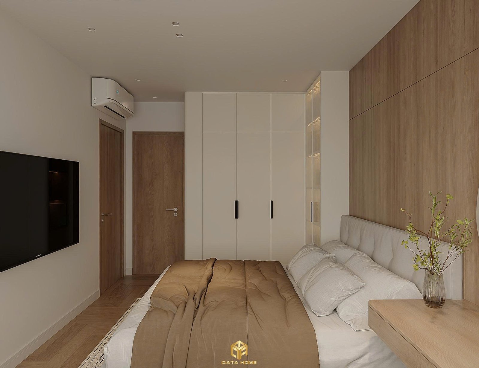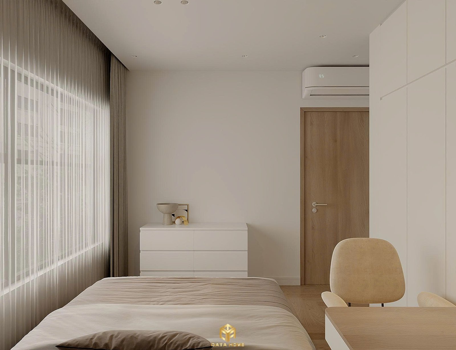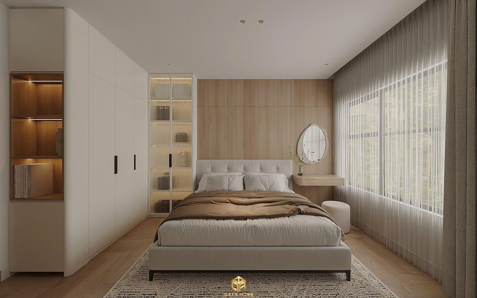 Phòng ngủ master mang đến cảm giác bình yên với giường gỗ thấp, chăn ga tone trung tính và hệ thống tủ quần áo liền tường. Cửa sổ lớn đón ánh sáng tự nhiên, rèm vải mỏng và bàn trang điểm nhỏ gọn tạo nên góc nghỉ ngơi đầy đủ tiện nghi. Ánh sáng gián tiếp sau đầu giường và kệ mở tích hợp ánh đèn ấm áp tăng thêm sự ấm cúng.