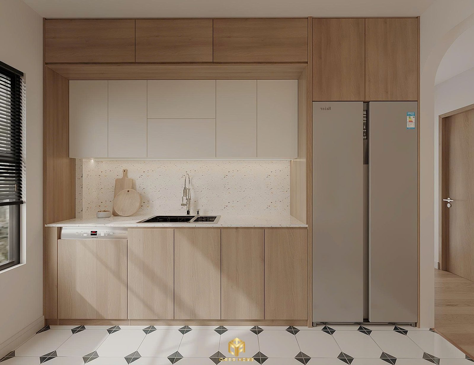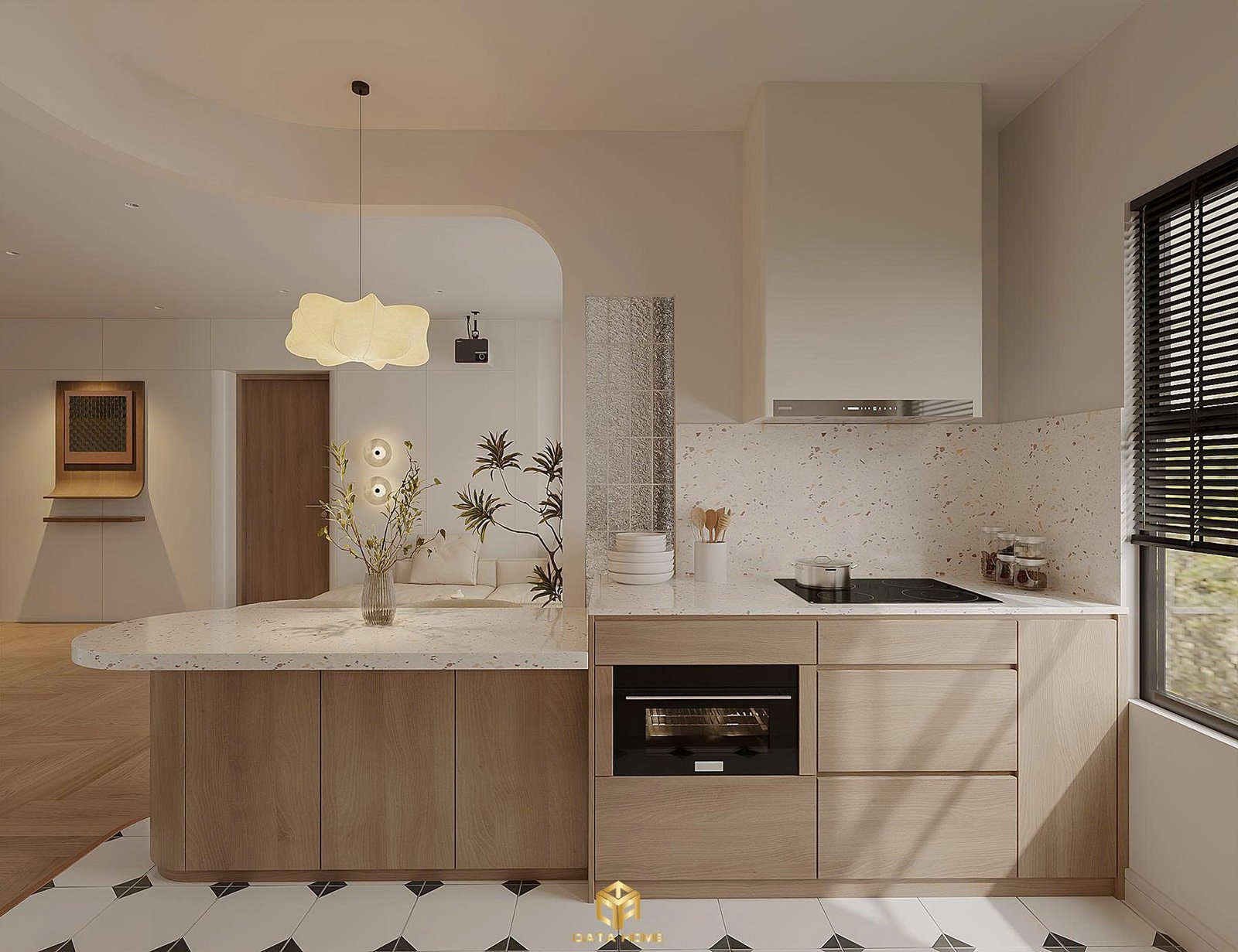Từ góc nhìn khác, vòm cong lớn nối liền bếp với phòng khách tạo cảm giác liền mạch và thông thoáng. Mẫu gạch họa tiết đen trắng trên sàn bếp thêm phần cá tính cho không gian.
