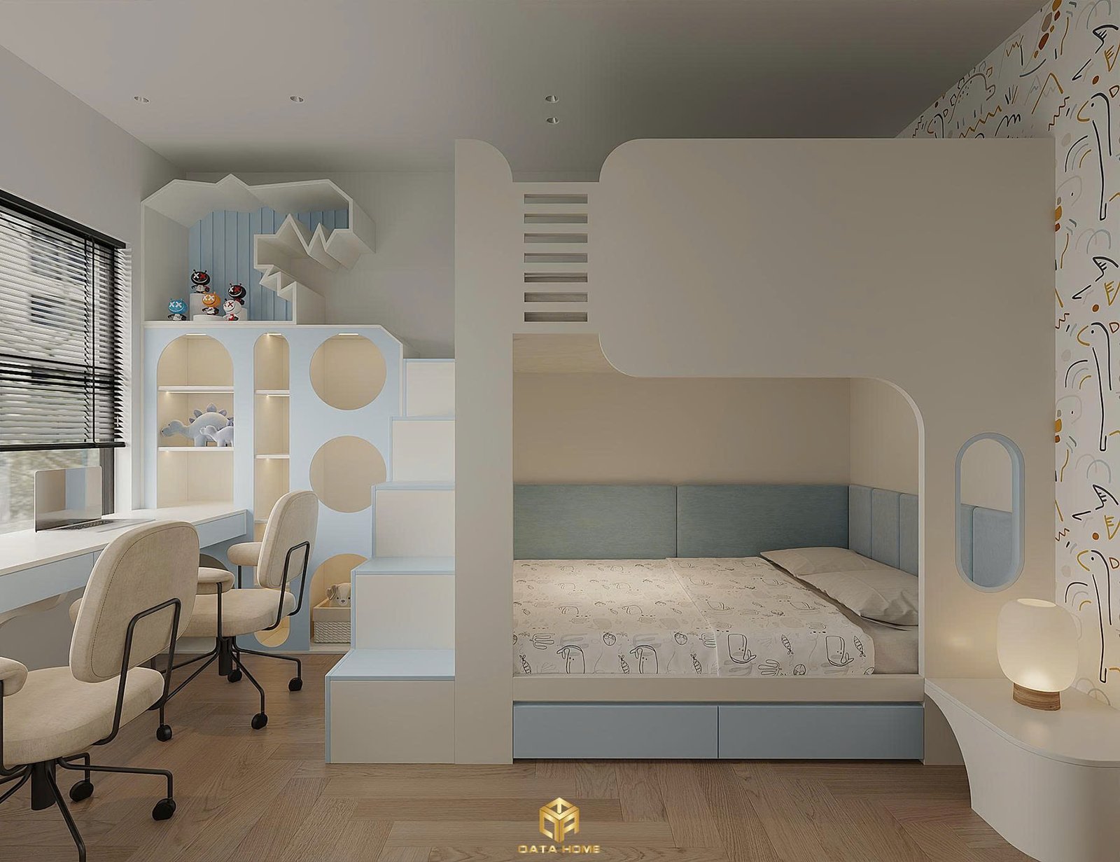 Phòng trẻ em gây ấn tượng với giường tầng hiện đại kết hợp kệ sách và bàn học thông minh. Tường decal hoạt hình vui nhộn, ghế ngồi ergonomics và ánh sáng tự nhiên từ cửa sổ tạo nên không gian vừa an toàn vừa khơi dậy trí tưởng tượng cho bé.