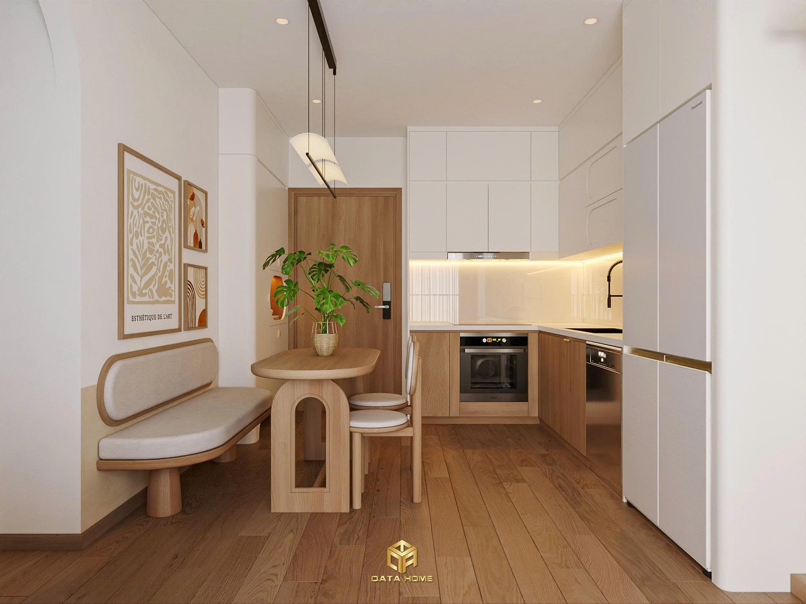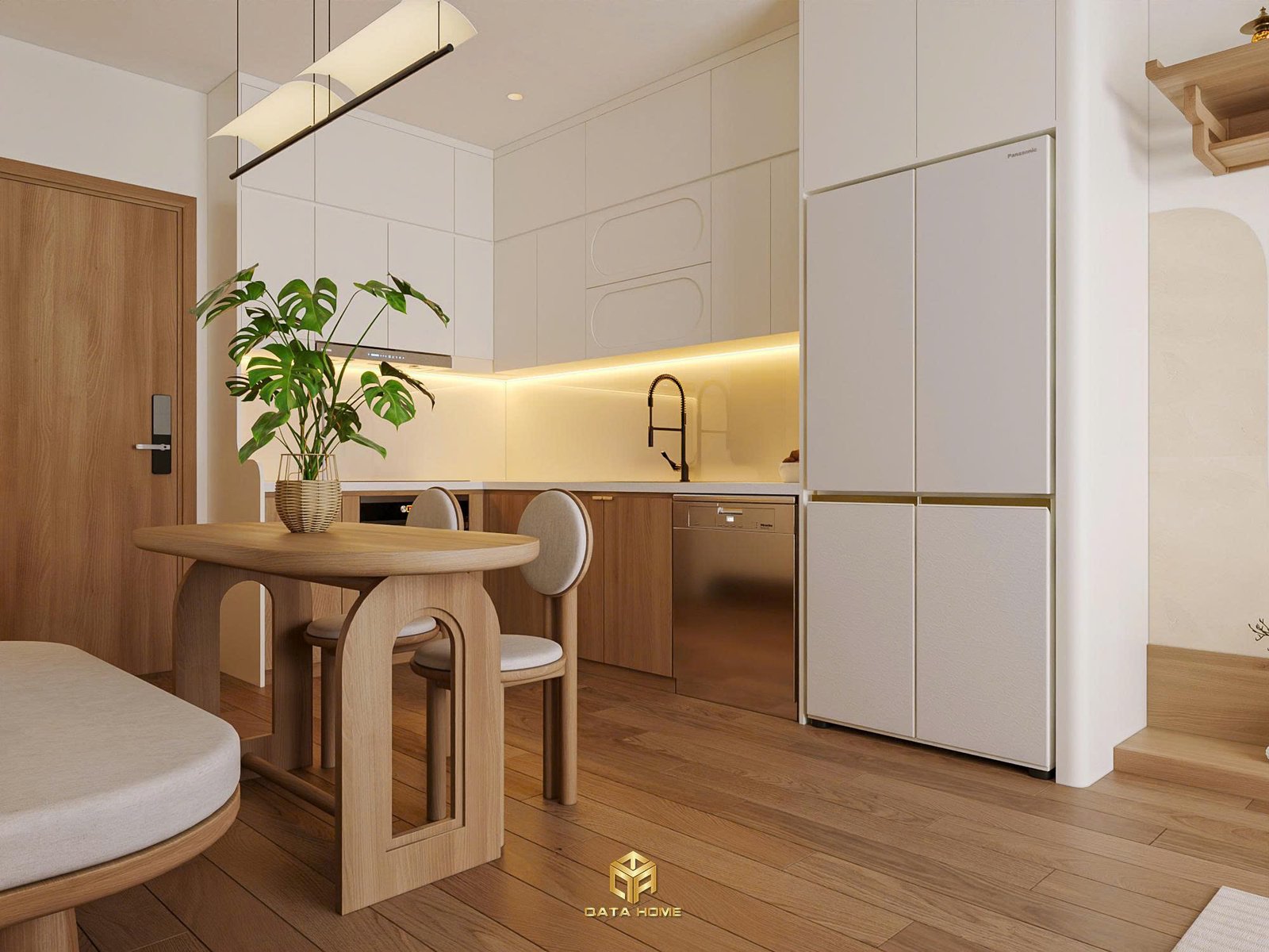 Không gian bếp trong căn hộ Vinsmart Wabi Sabi được thiết kế mở, liền mạch với khu vực phòng khách nhưng vẫn giữ được sự riêng tư nhờ bố cục khéo léo.