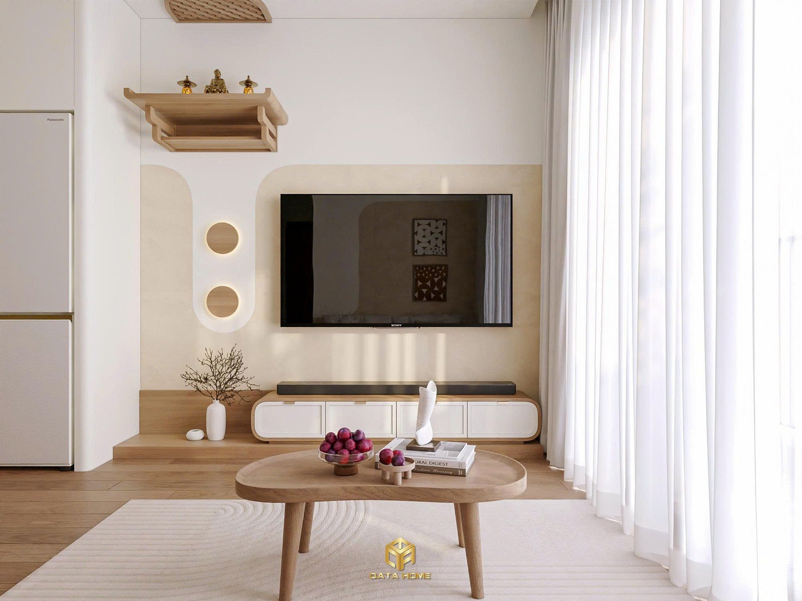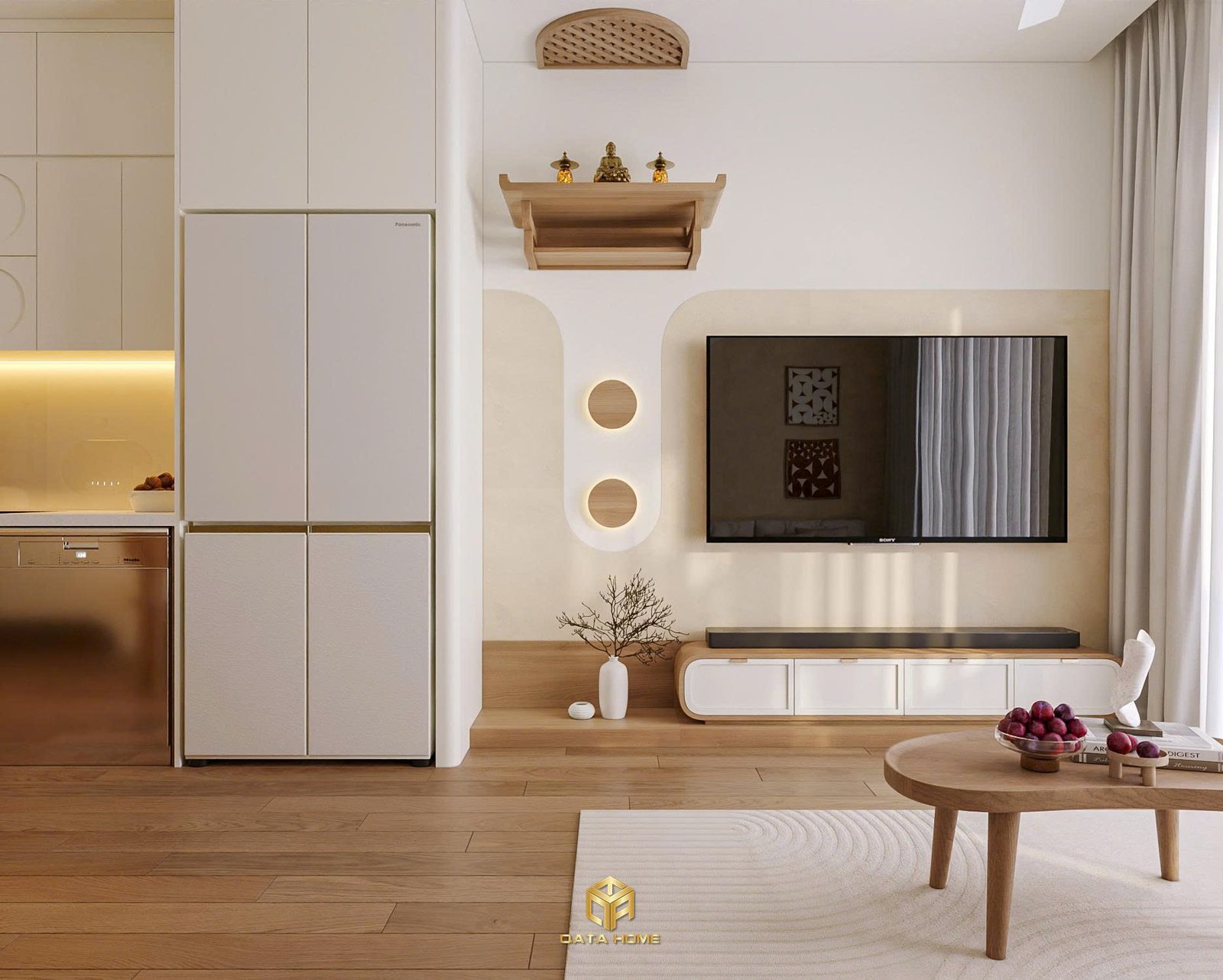 Gam màu be – trắng – gỗ sáng tạo nên một bảng màu dịu mắt. Những đường cong mềm mại xuất hiện xuyên suốt từ mảng tường TV, kệ trang trí cho đến bàn trà, tạo nên sự liên kết thị giác đầy tinh tế.