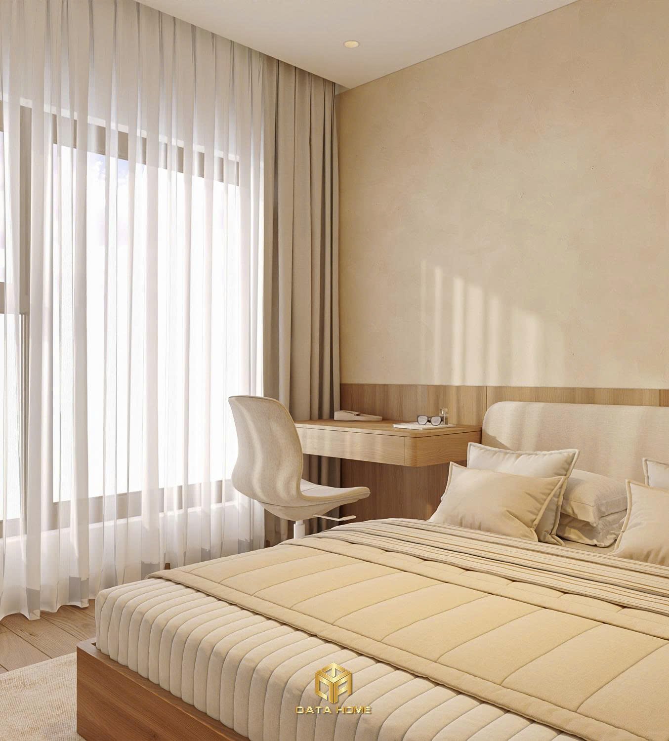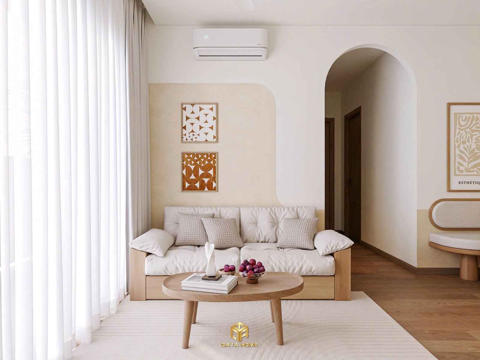 Ngay từ những bước chân đầu tiên, không gian mở ra bằng bảng màu trung tính: trắng ngà, be, nâu gỗ… tất cả hòa quyện như một bản nhạc chậm. Không có sự phô trương, không cầu kỳ chi tiết – chỉ là những đường cong mềm mại, chất liệu tự nhiên và ánh sáng dịu dàng len lỏi qua từng góc nhỏ.
