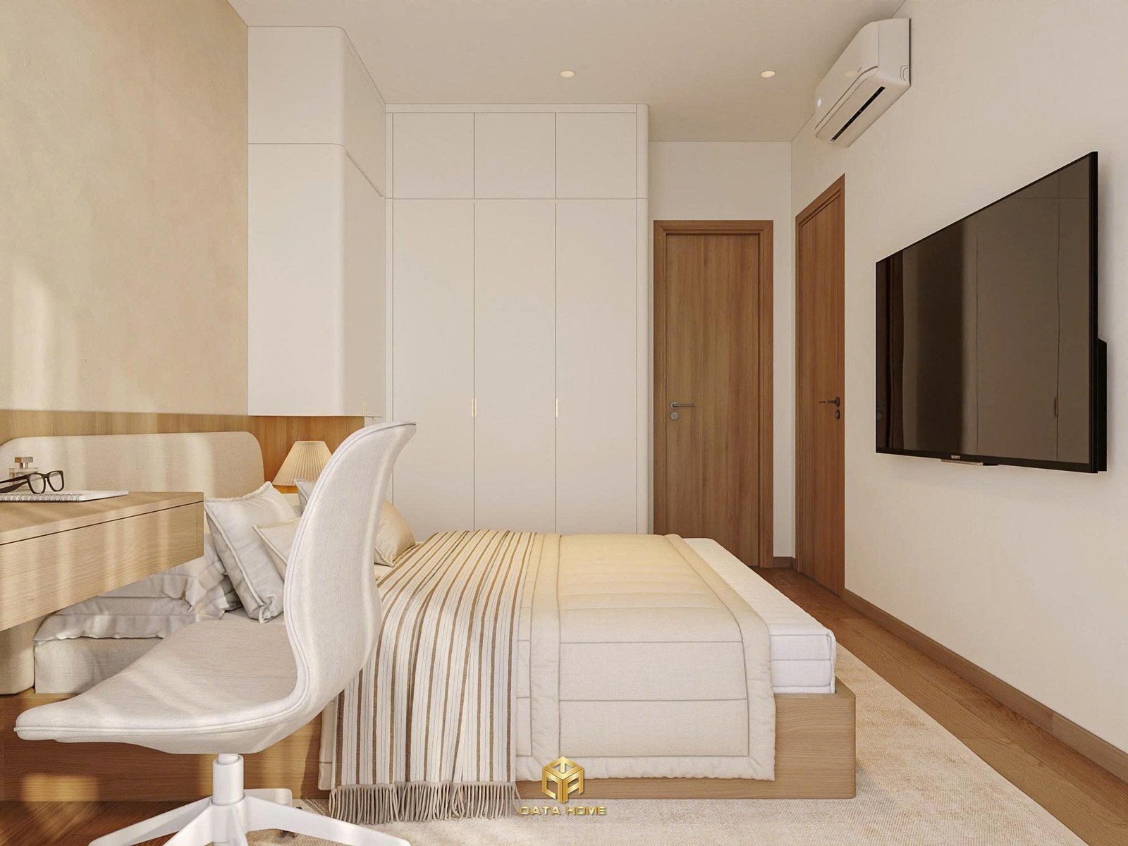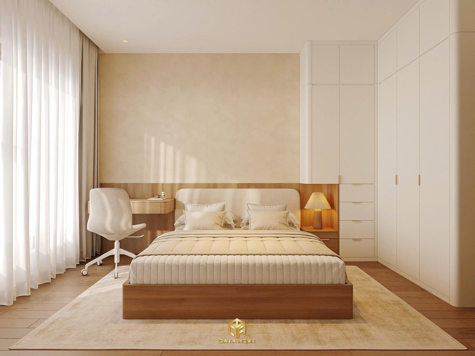 Giường ngủ thấp, chất liệu gỗ tự nhiên, kết hợp ánh sáng vàng dịu tạo nên một không gian dễ chịu. Tủ quần áo âm tường giúp tối ưu diện tích, đồng thời giữ cho tổng thể luôn gọn gàng.