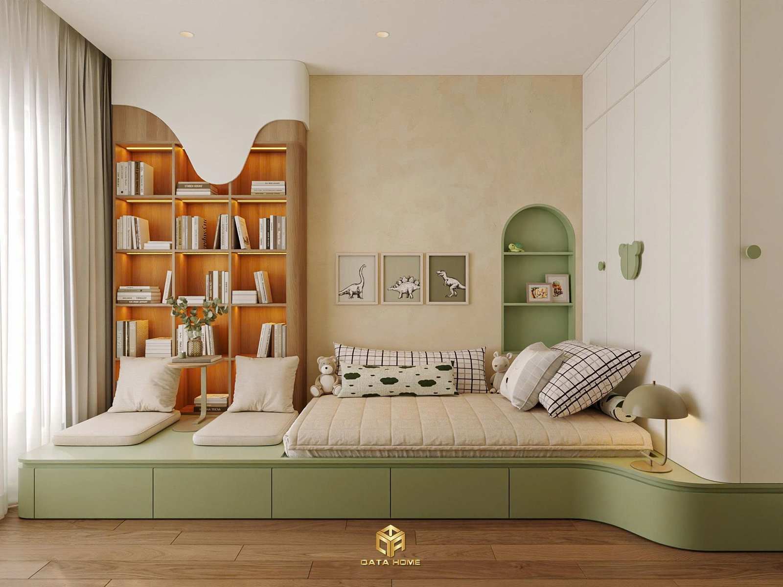 Giường thấp, khu đọc sách tích hợp cùng hệ kệ cong mềm mại tạo nên một không gian vừa an toàn, vừa kích thích trí tưởng tượng của trẻ.