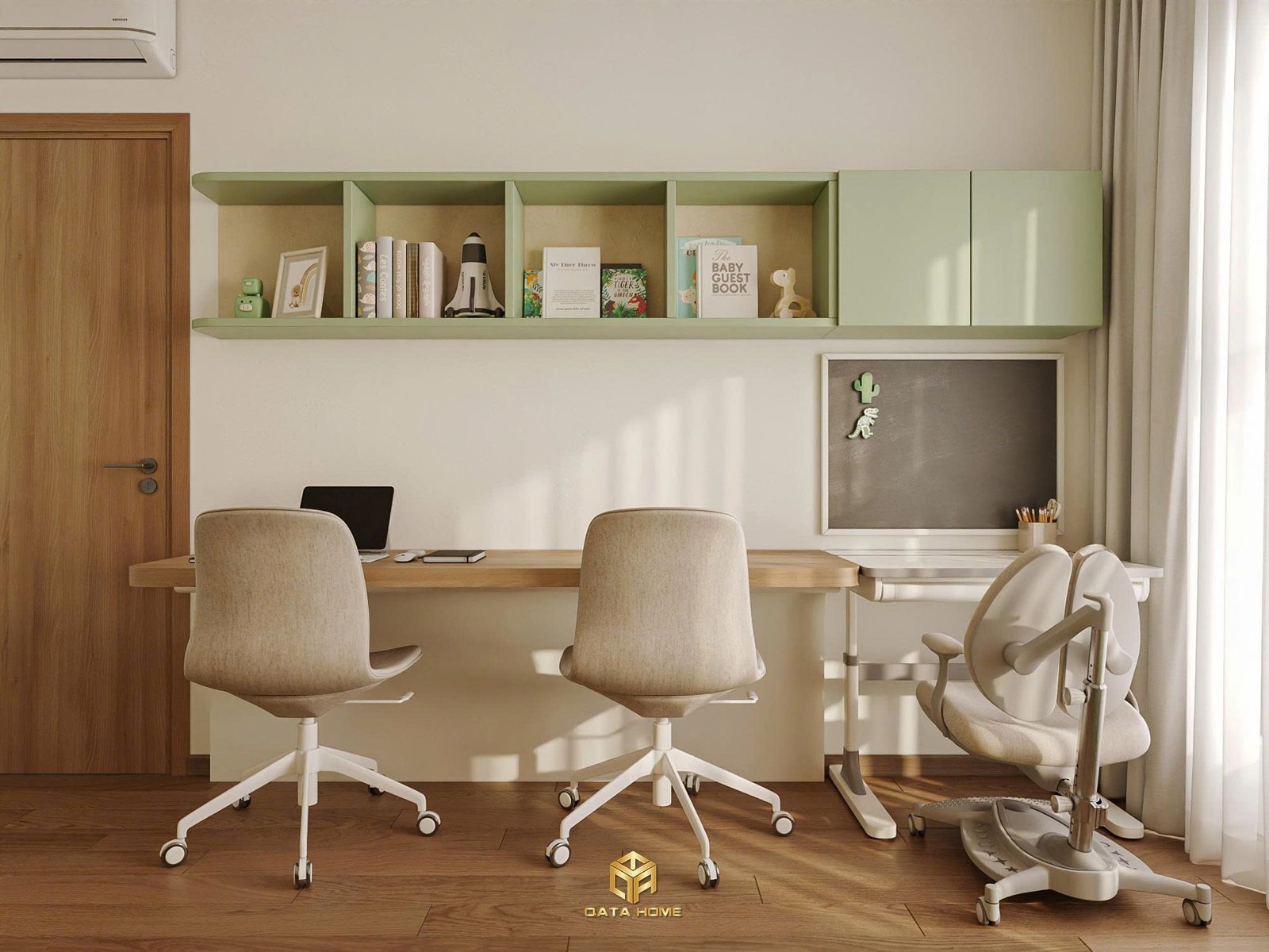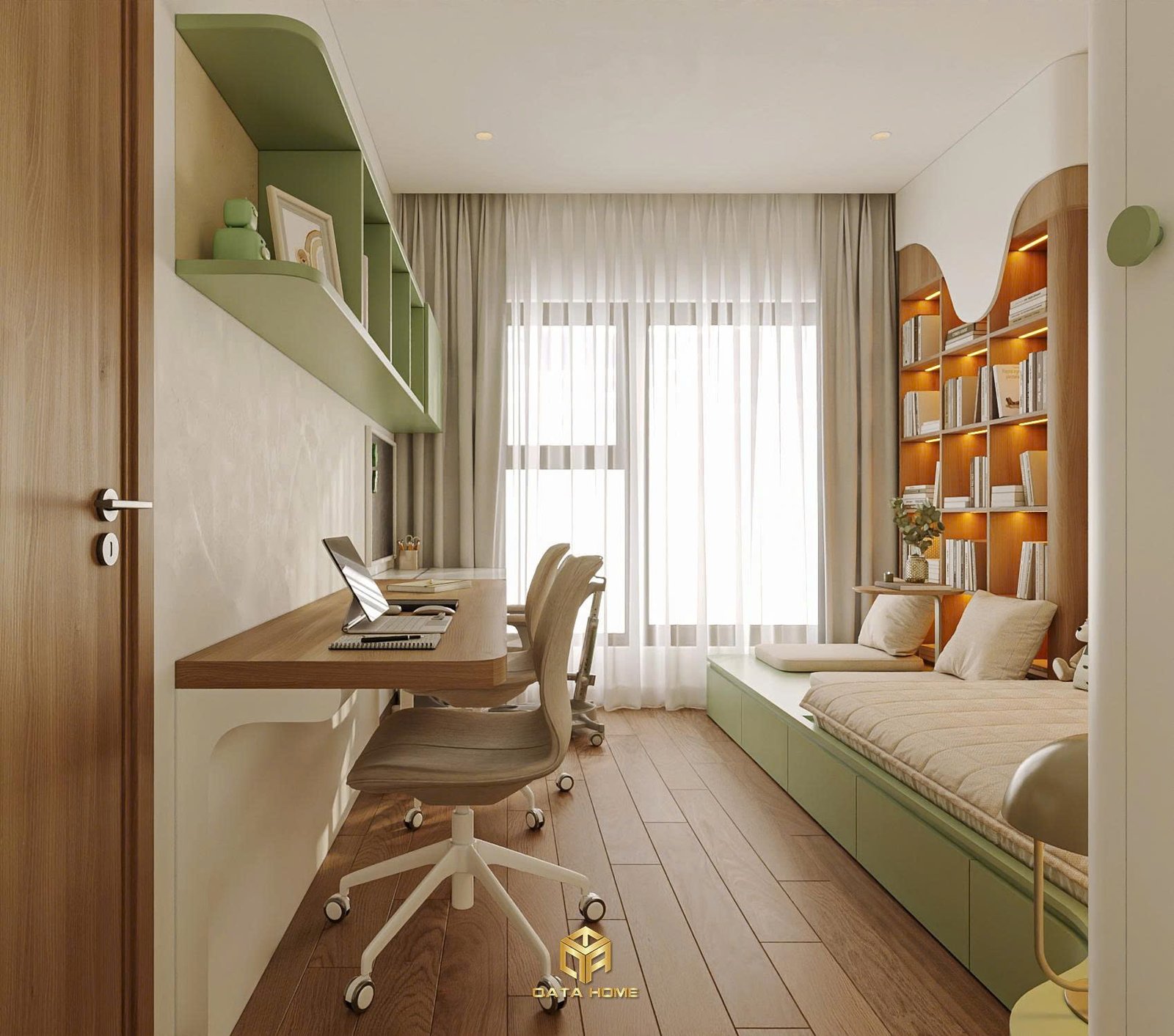 Điểm đặc biệt trong căn hộ Vinsmart Wabi Sabi là cách thiết kế phòng trẻ em. Không gian vẫn giữ tinh thần chung nhưng được thêm vào những gam màu nhẹ nhàng như xanh pastel.