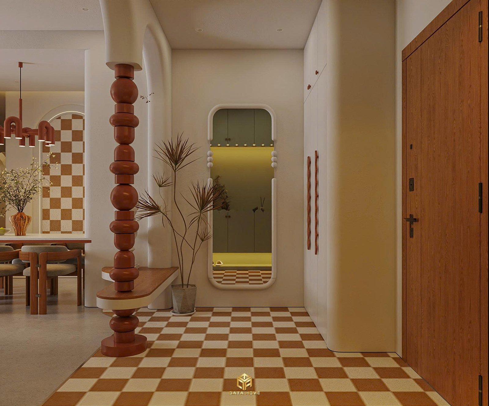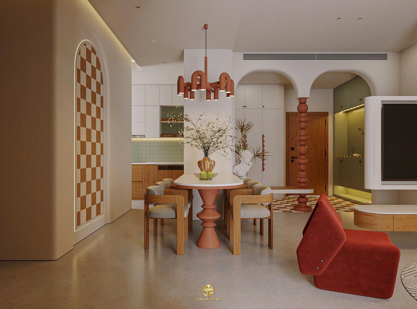 Dự án thiết kế nội thất chung cư wabi sabi này gây ấn tượng ngay từ cái nhìn đầu tiên với tone màu chủ đạo là be – nâu đất – đỏ gạch. Không gian không sử dụng quá nhiều chi tiết cầu kỳ, thay vào đó là những đường cong mềm mại, vật liệu tự nhiên và ánh sáng dịu nhẹ.