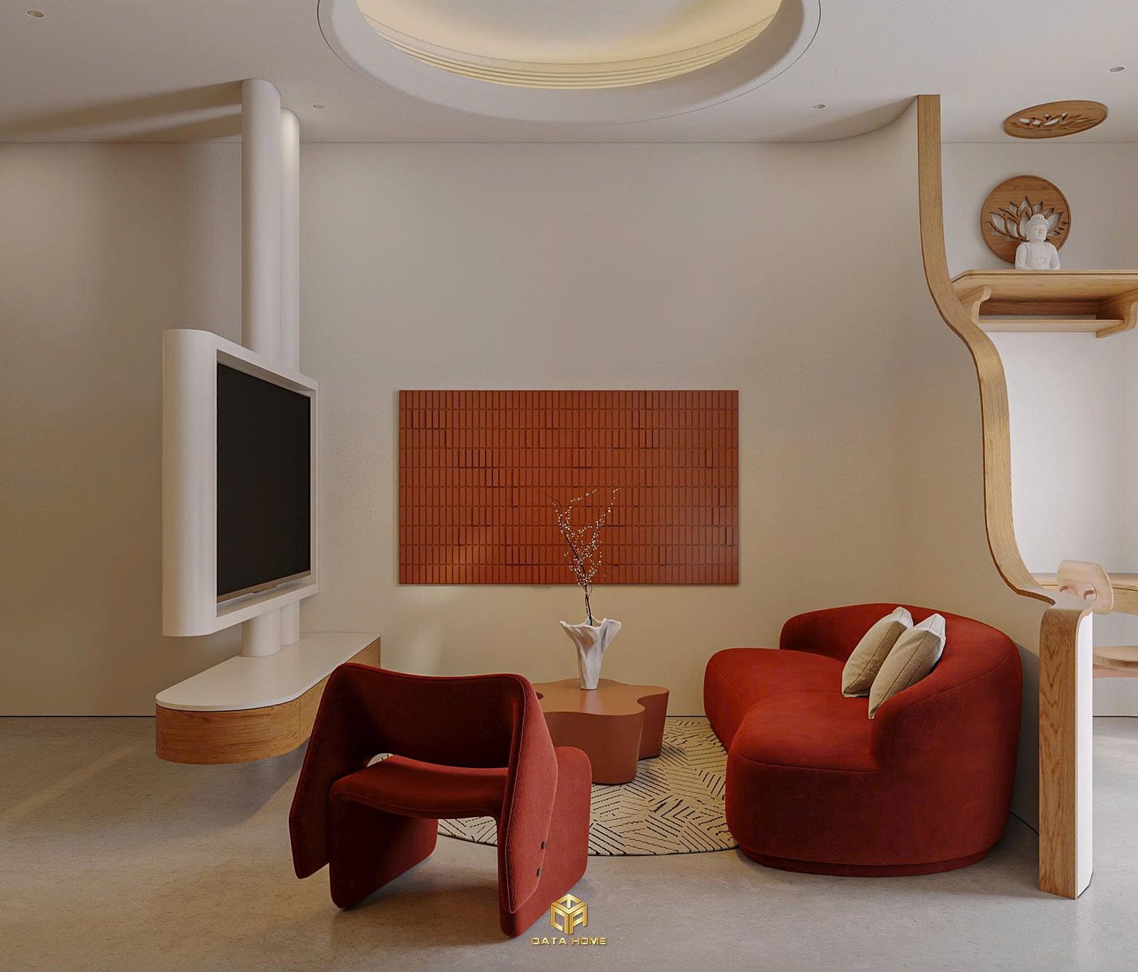 Vách tivi được thiết kế đơn giản, bo cong nhẹ, vừa đủ để tạo điểm nhấn mà không gây rối mắt. Bàn trà hình khối mềm mại, thảm trải sàn họa tiết nhẹ – tất cả đều hướng đến cảm giác thư giãn.