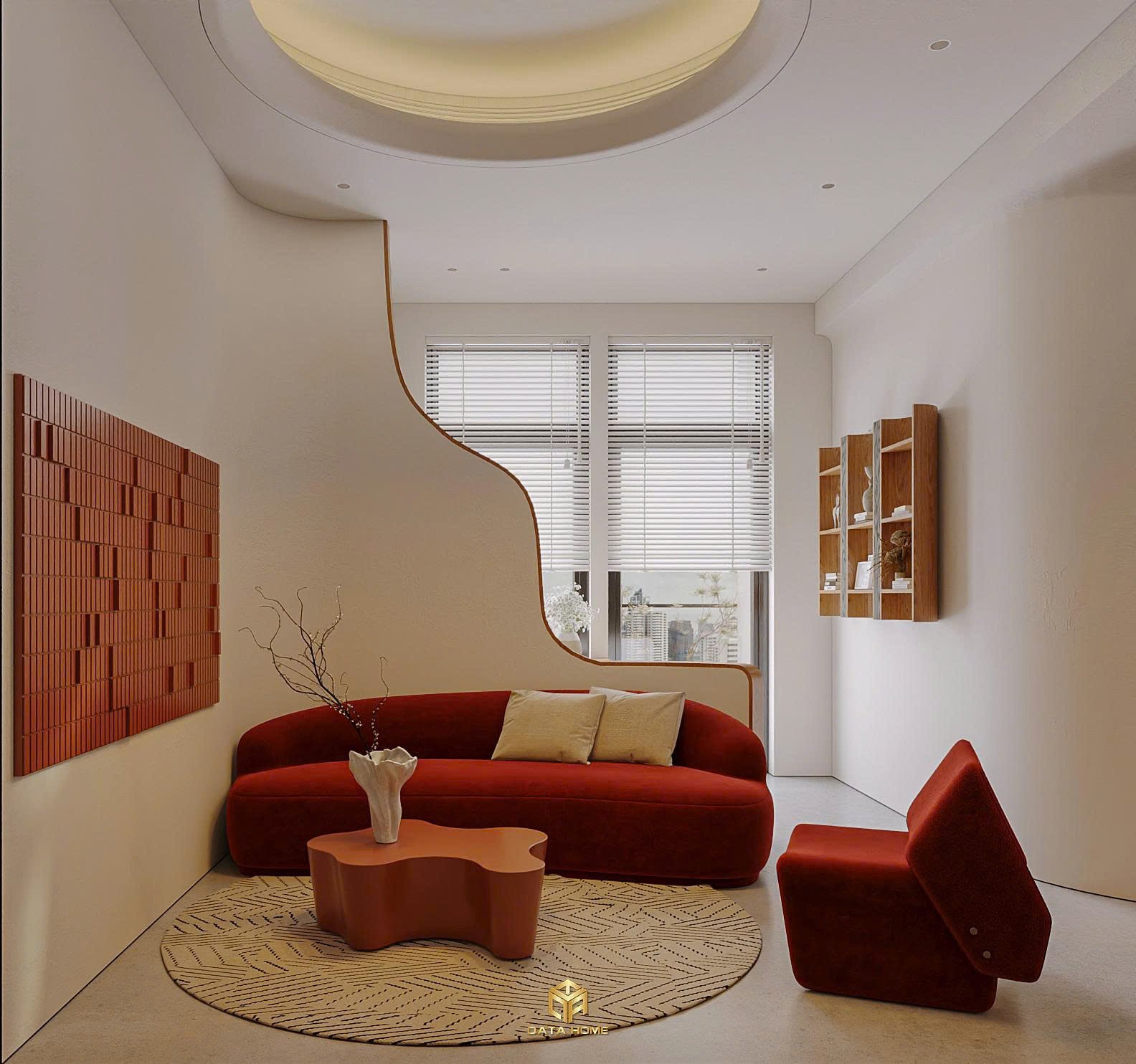 Phòng khách là nơi thể hiện rõ nhất tinh thần của thiết kế nội thất chung cư wabi sabi. Bộ sofa đỏ gạch nổi bật nhưng không hề “gắt”, mà ngược lại rất ấm áp khi đặt trong nền màu trung tính.