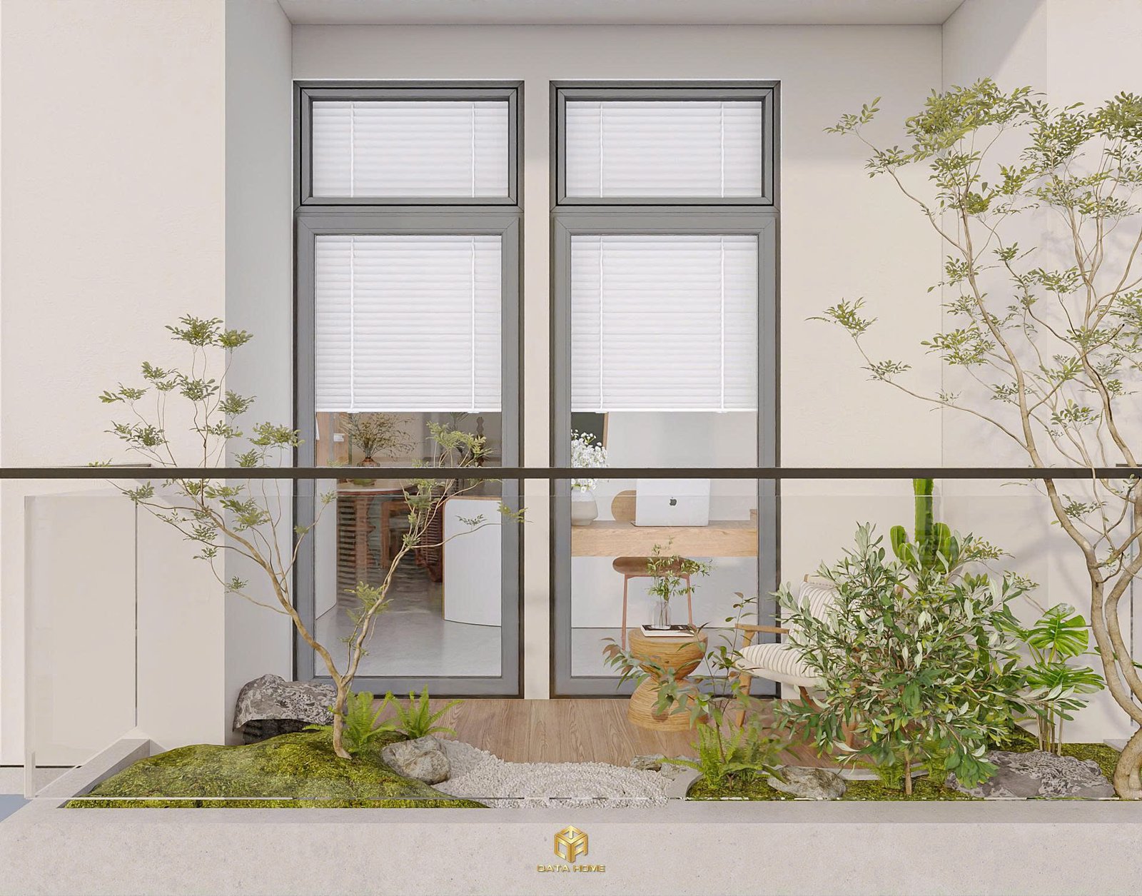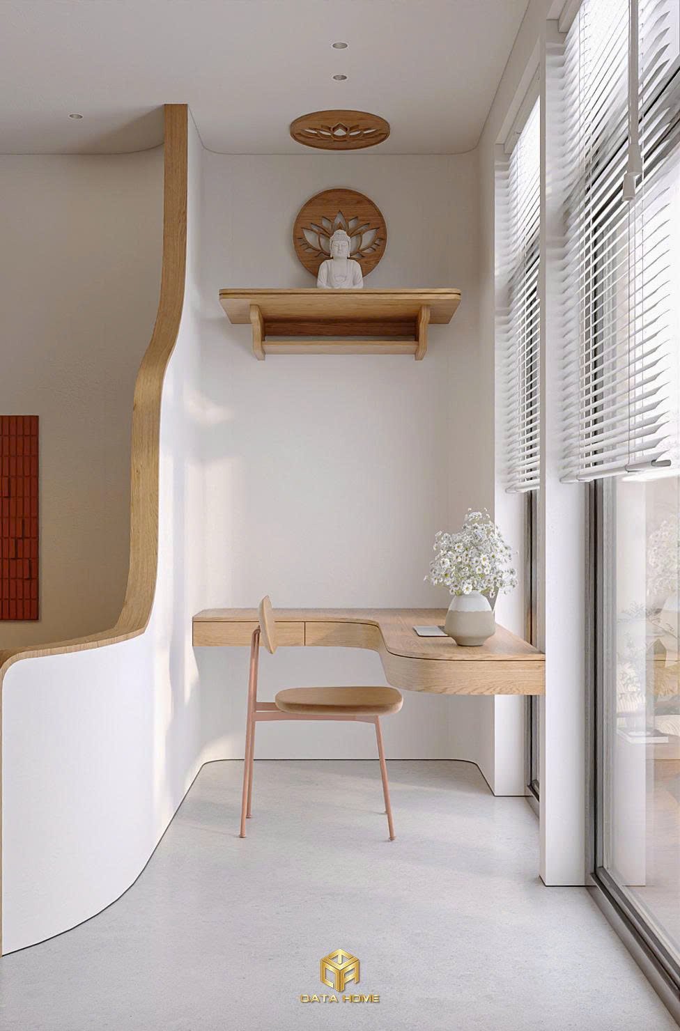 Góc làm việc đặt sát cửa sổ, sử dụng bàn gỗ đơn giản, đủ để làm việc nhưng không tạo cảm giác áp lực. Ban công nhỏ được bố trí cây xanh, đá và sỏi, mang hơi hướng thiền – rất đúng tinh thần wabi sabi.