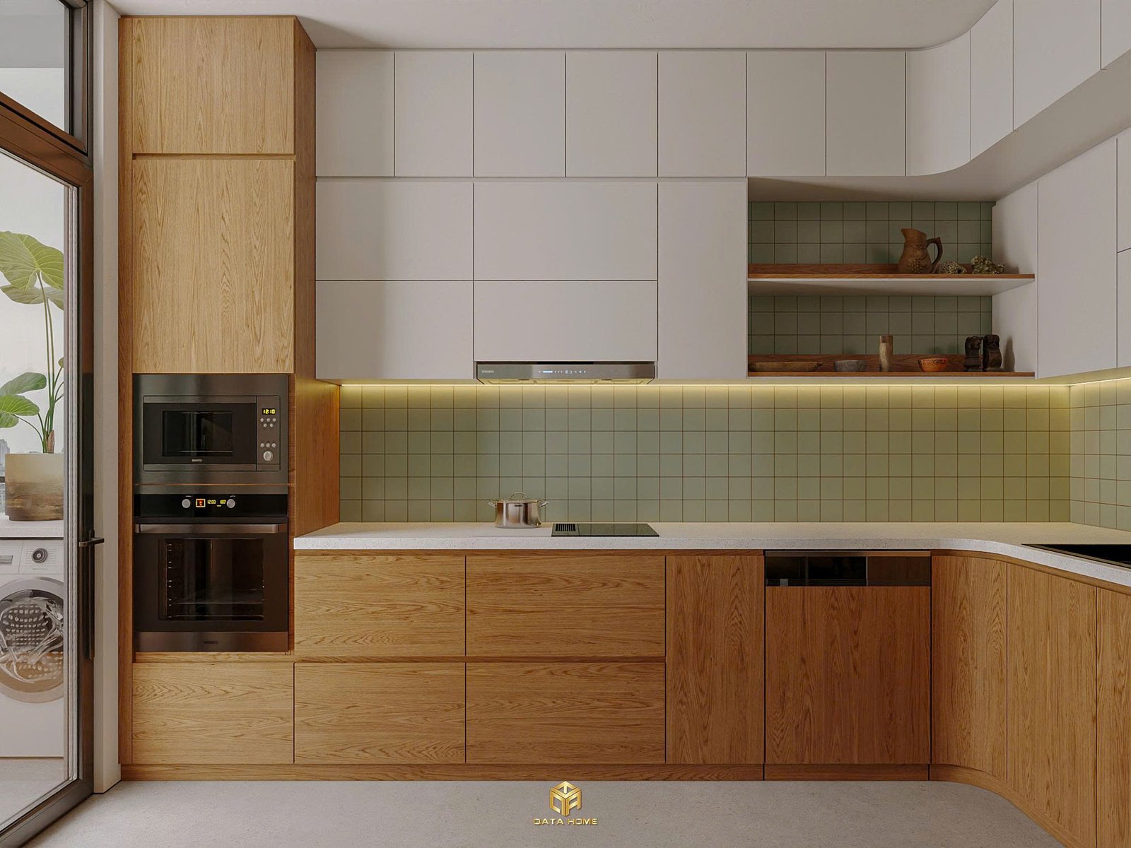 Khu bếp trong dự án thiết kế nội thất chung cư wabi sabi sử dụng vật liệu gỗ kết hợp với gạch xanh nhạt, tạo nên sự cân bằng giữa ấm và mát.
