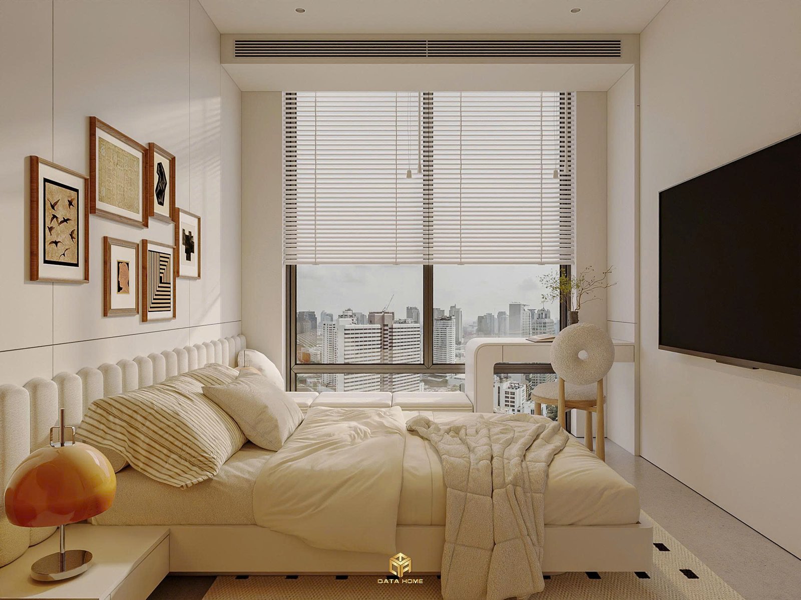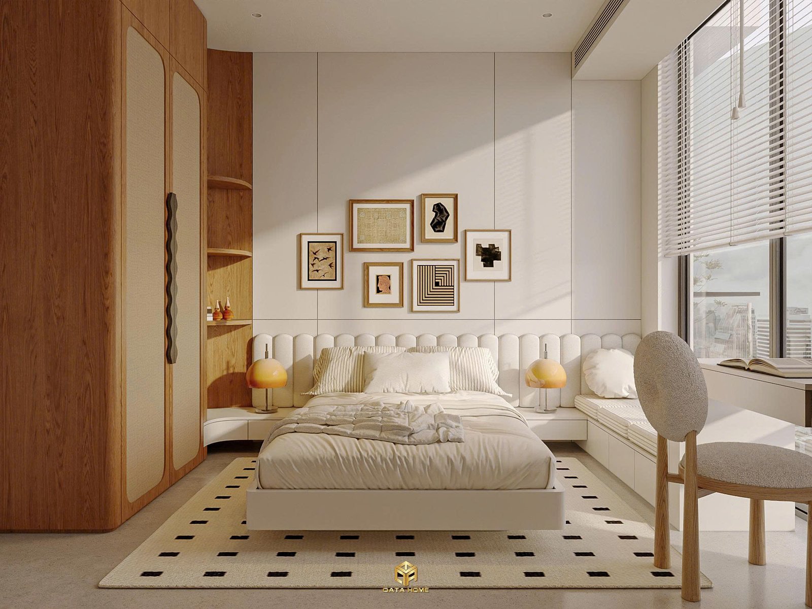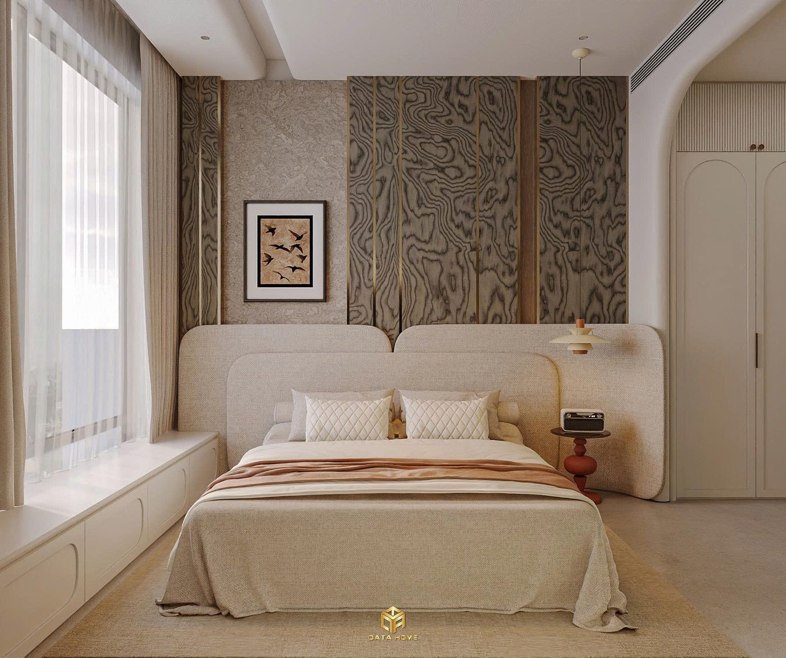 Giường thấp, màu sắc trung tính, kết hợp với ánh sáng tự nhiên từ cửa sổ lớn giúp căn phòng luôn thoáng và dễ chịu. Các chi tiết trang trí như tranh treo, đèn ngủ hay kệ gỗ đều rất nhẹ nhàng.