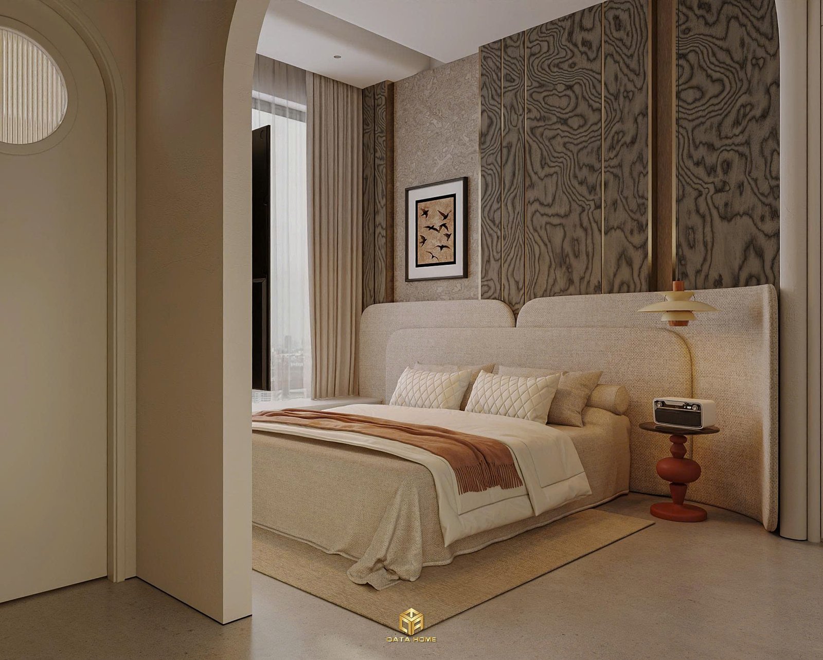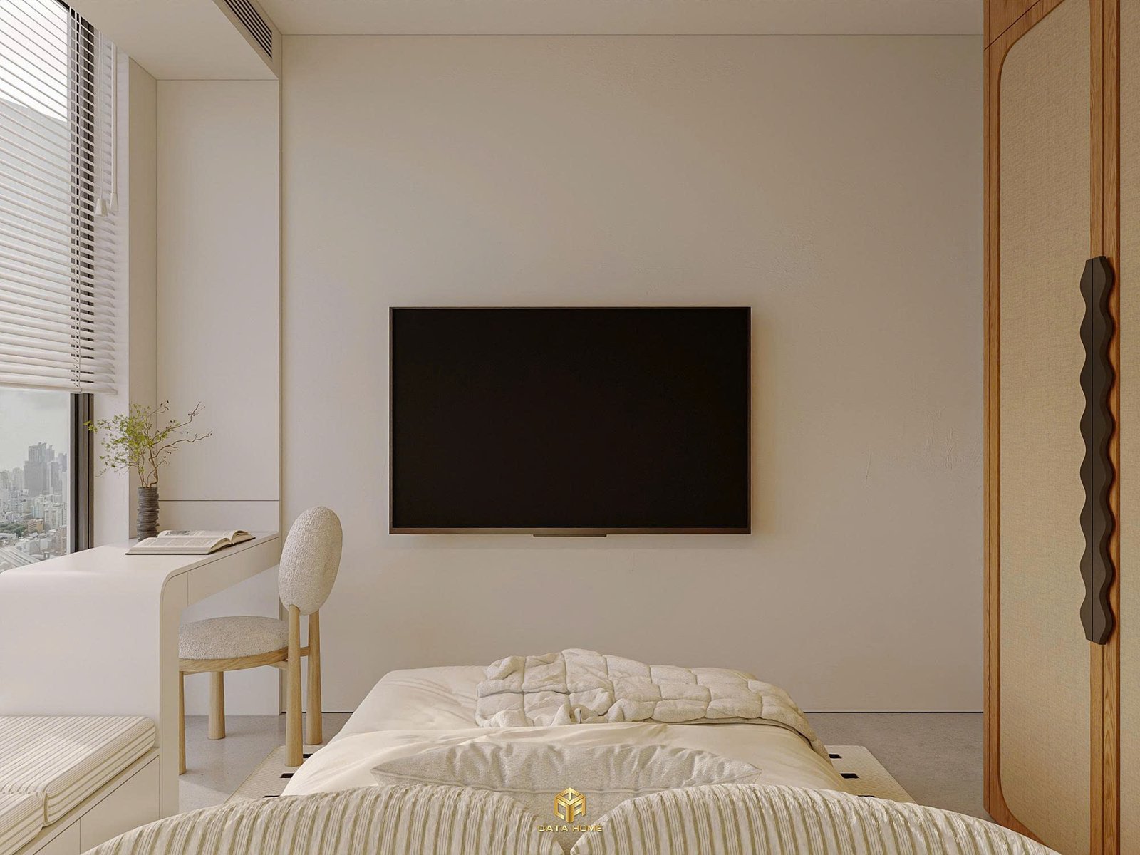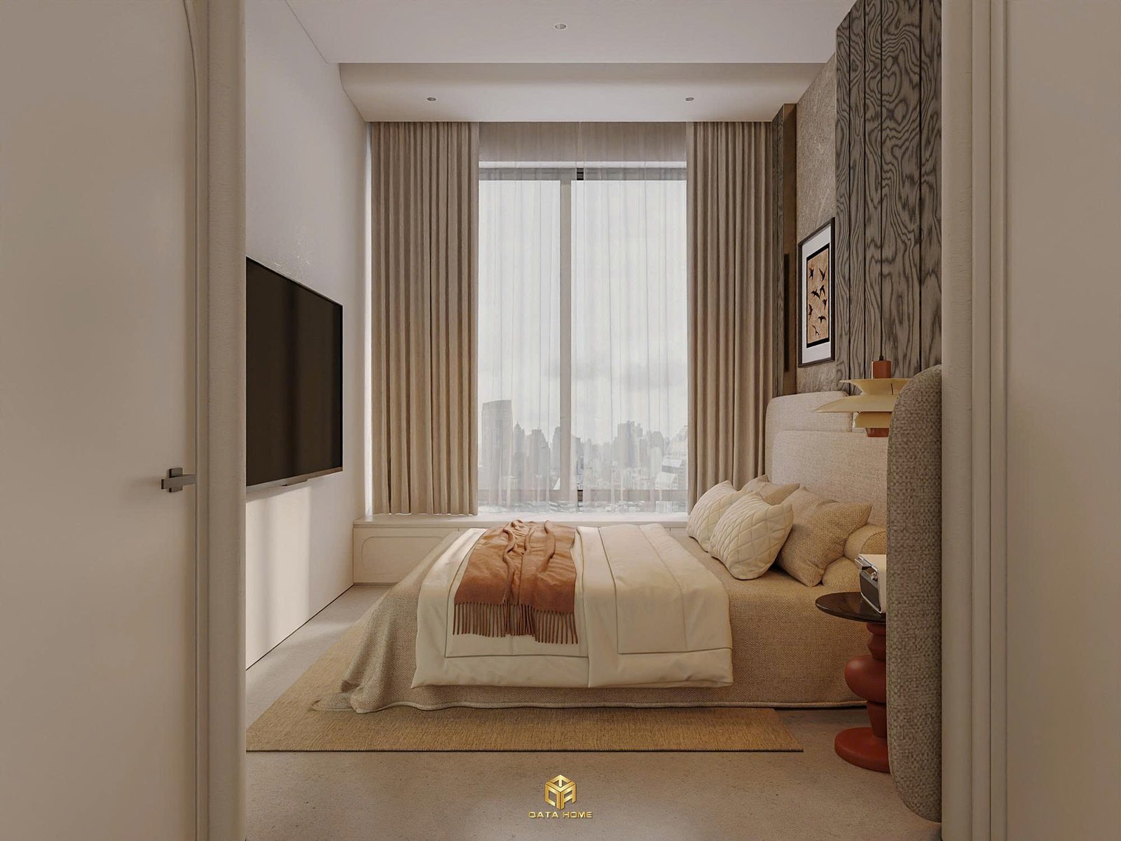 Phòng ngủ là nơi thể hiện rõ triết lý “ít nhưng đủ”. Trong thiết kế nội thất chung cư wabi sabi, không gian này được tiết chế tối đa chi tiết.