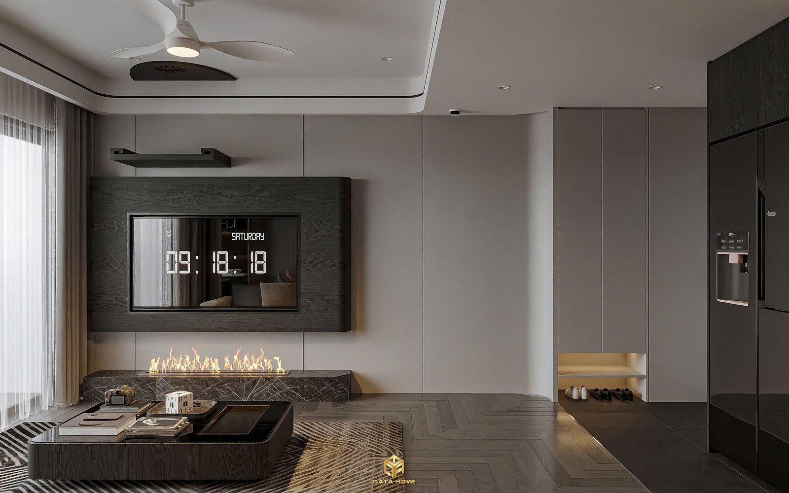 Thiết kế nội thất hiện đại chung cư Canopy với hệ vách TV tích hợp lò sưởi điện nghệ thuật.
