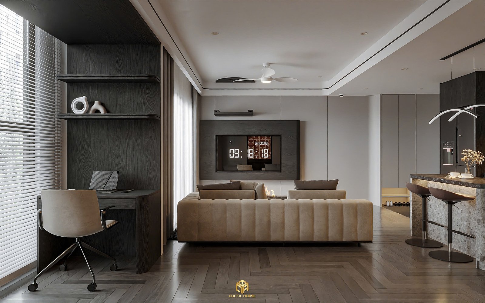 Góc nhìn từ bàn làm việc ra phòng khách trong thiết kế nội thất hiện đại chung cư Canopy.