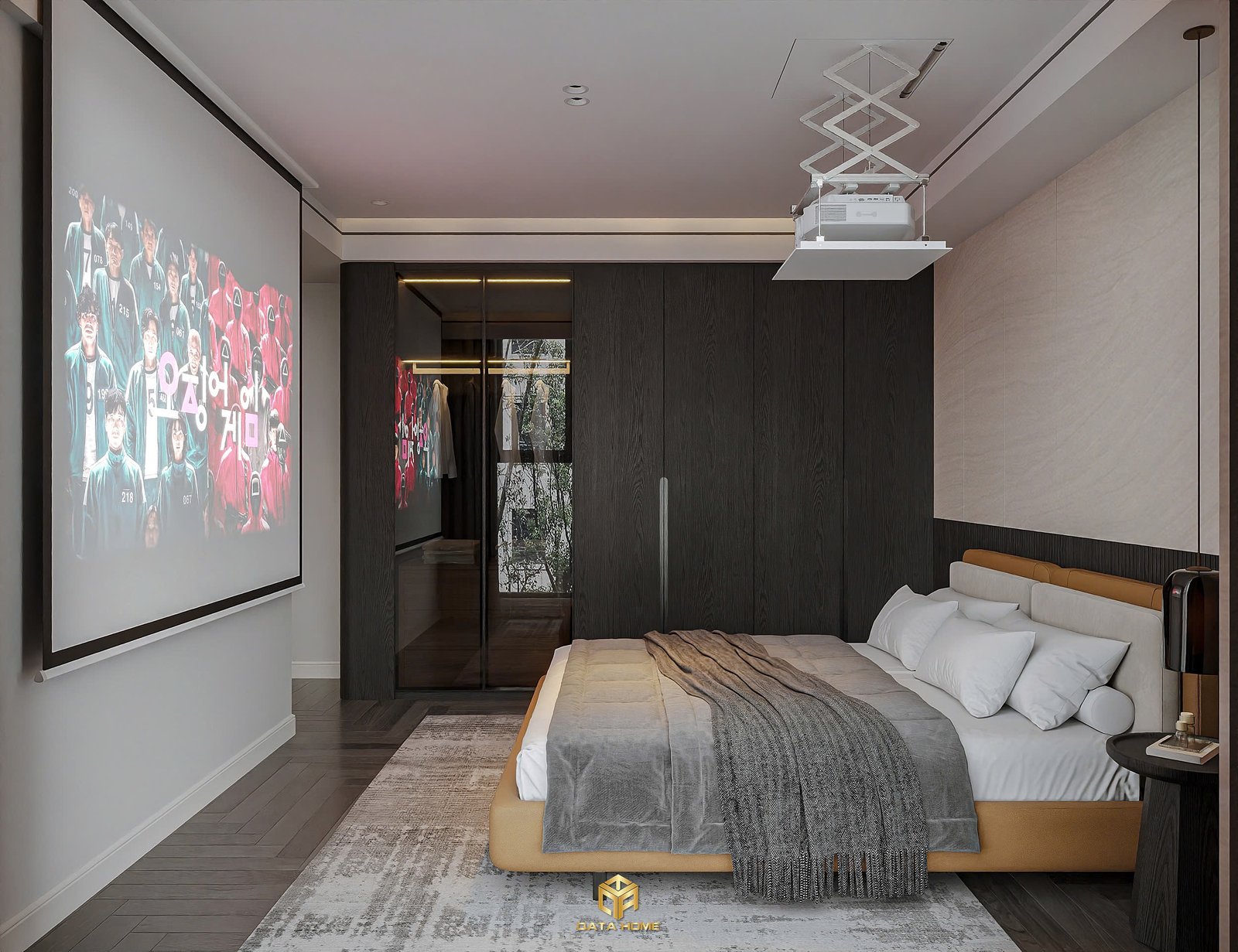 Đặc biệt, việc trang bị máy chiếu thay vì TV truyền thống giúp căn phòng trở nên gọn gàng và mang lại trải nghiệm điện ảnh thực thụ.