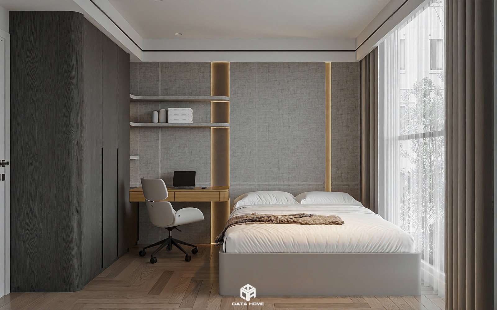 Phòng ngủ phụ cũng được chăm chút tỉ mỉ với hệ tủ quần áo cánh kính và bàn học tích hợp, tối ưu diện tích cho các căn hộ chung cư.