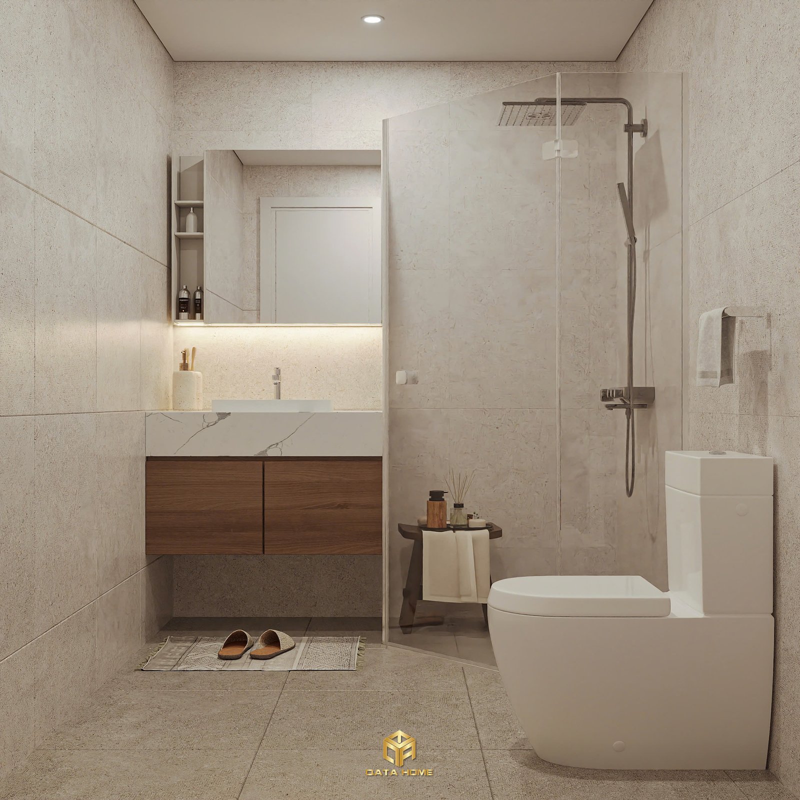 Trong mẫu thiết kế nội thất hiện đại chung cư Canopy, nhà vệ sinh ưu tiên sử dụng gạch ốp lát khổ lớn tone xám xi măng tạo cảm giác sạch sẽ và mở rộng diện tích.