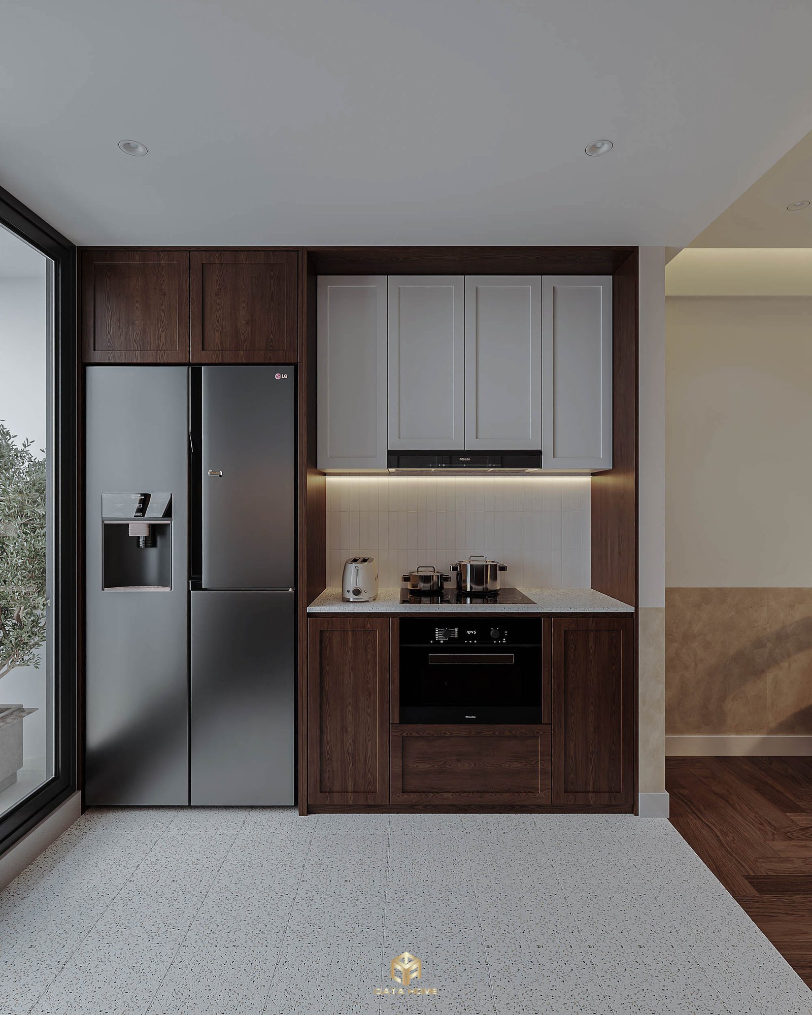 Bếp hiện đại với tủ gỗ óc chó, tủ trắng và tủ lạnh LG – không gian nấu nướng đẳng cấp.
