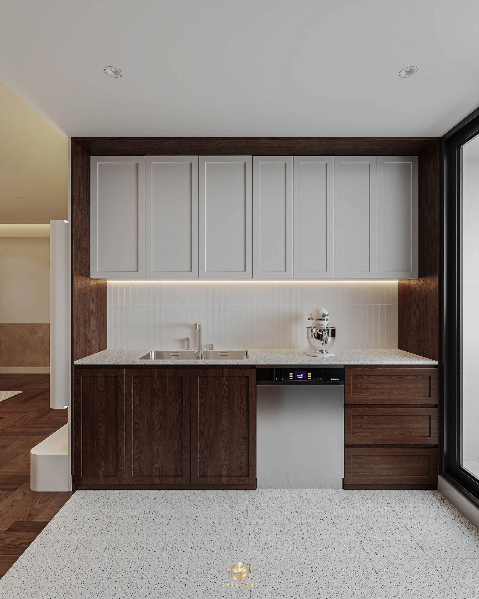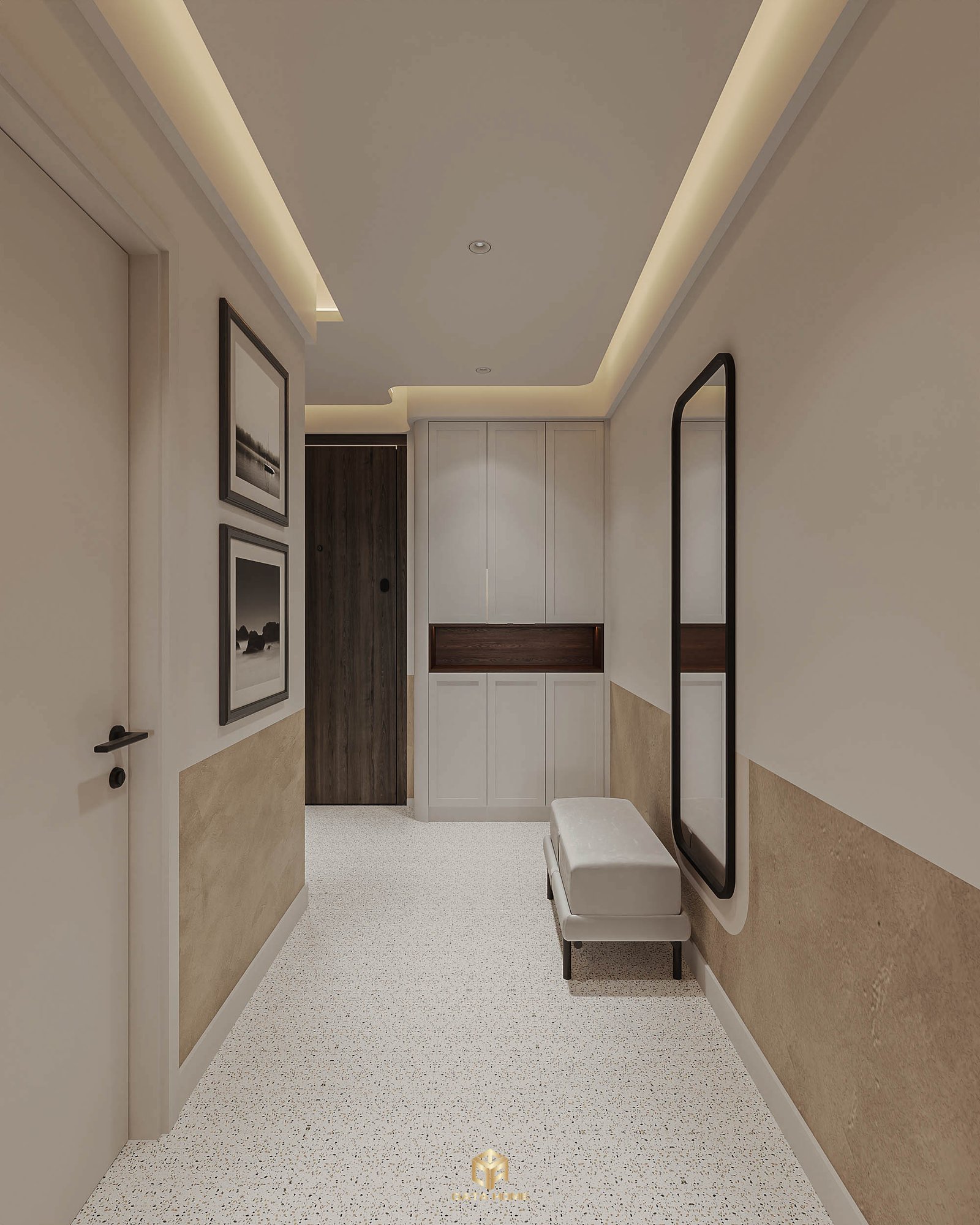 Góc nhìn khác của hành lang với tủ âm tường trắng – nâu, thể hiện sự tối giản sang trọng.