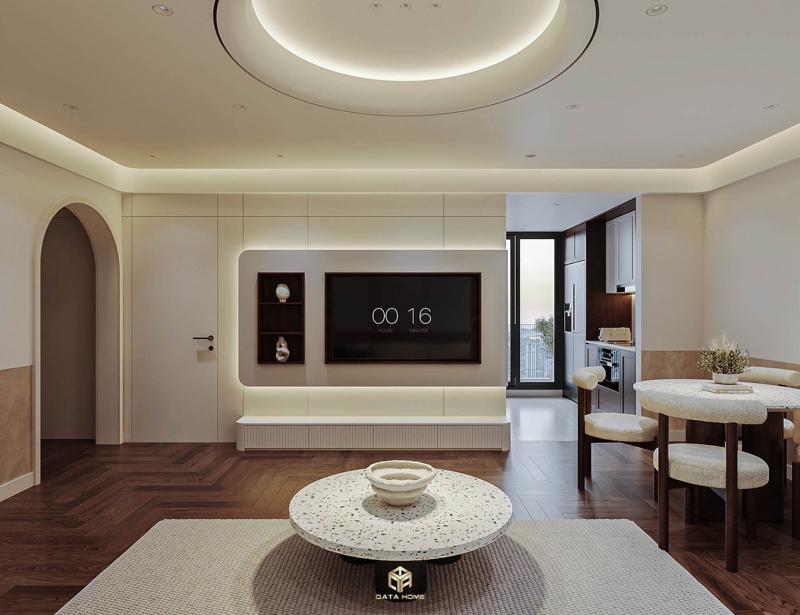 Phòng khách mở rộng với ghế sofa boucle cong mềm, bàn trà terrazzo tròn và TV treo tường hiện đại. Đèn trần hình tròn lớn tạo điểm nhấn ấn tượng, kết hợp kệ âm tường và cửa sổ lớn đón view panorama.