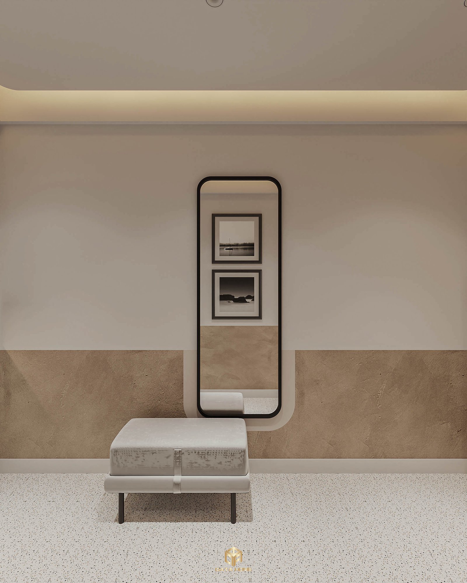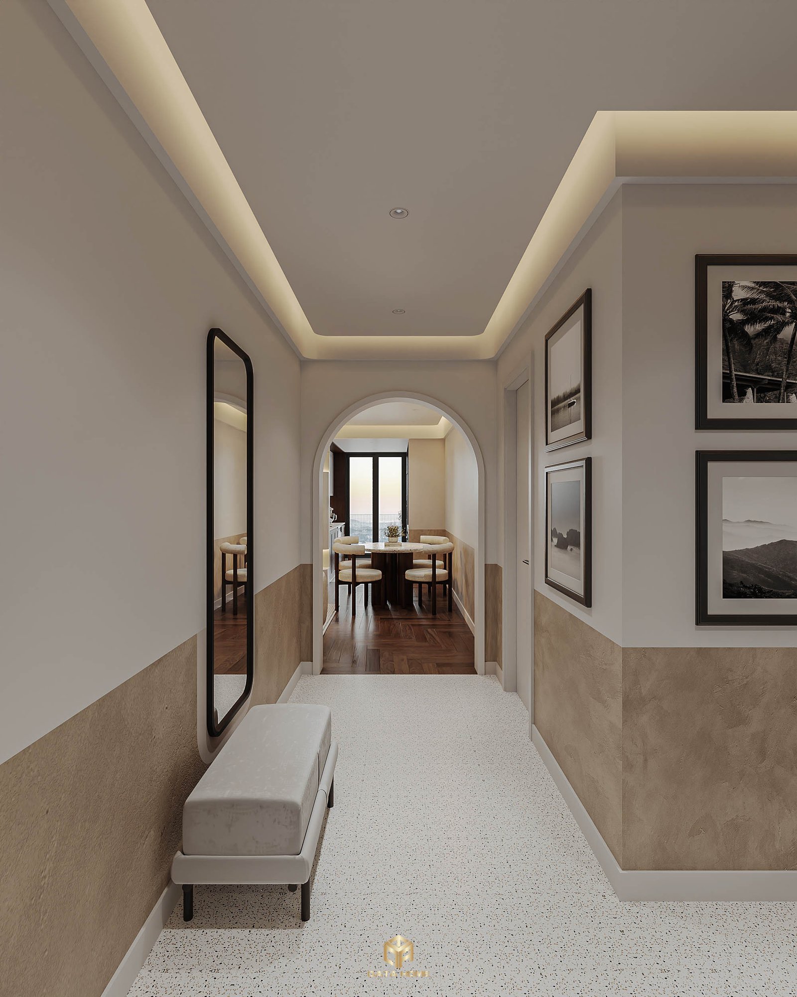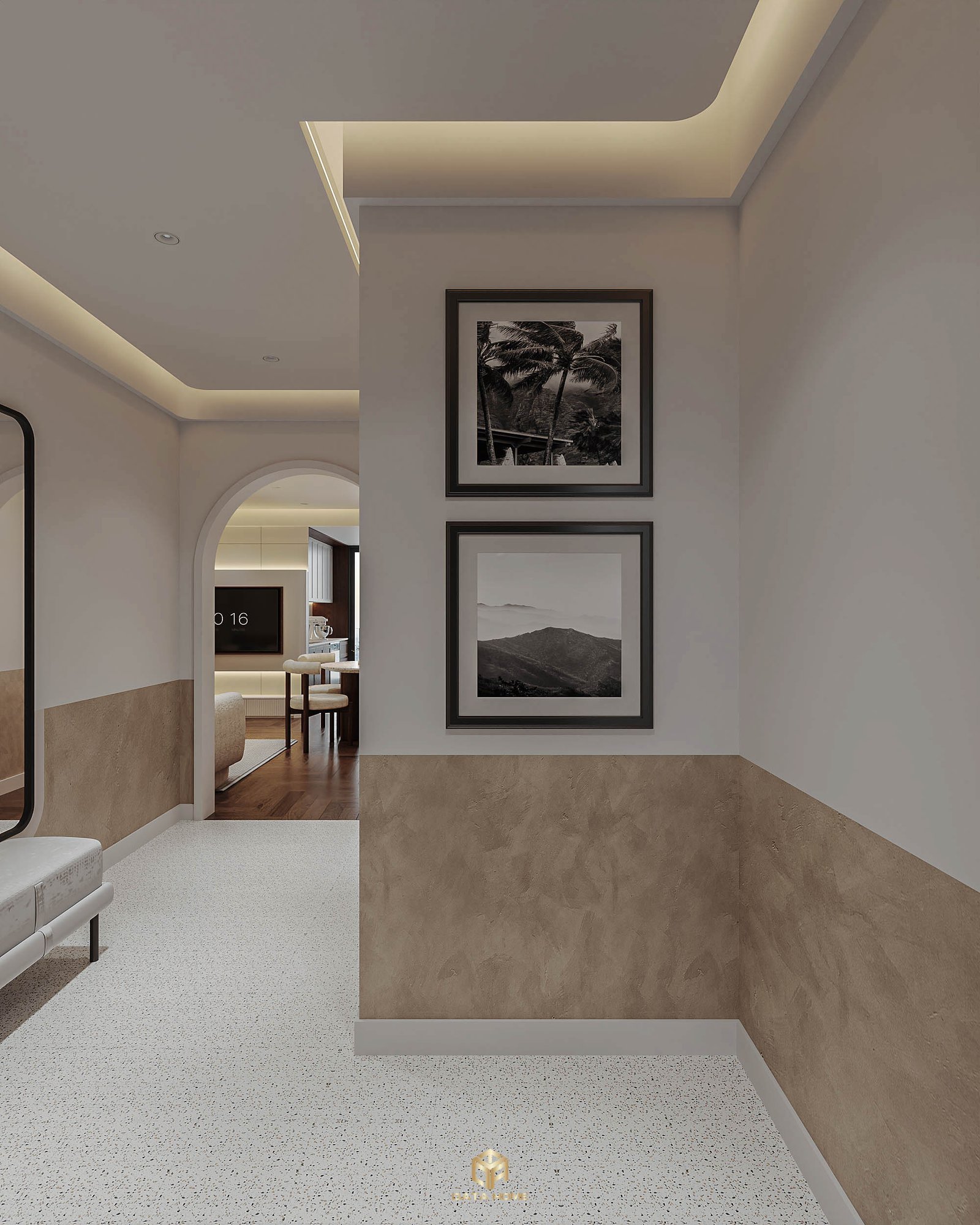 Bước vào căn hộ, hành lang dài rộng như một gallery nghệ thuật. Gương đen cao lớn phản chiếu ánh sáng, ghế bench terrazzo trắng ngồi chờ, cùng khung tranh phong cảnh treo tường tạo cảm giác cao cấp ngay từ giây đầu tiên.