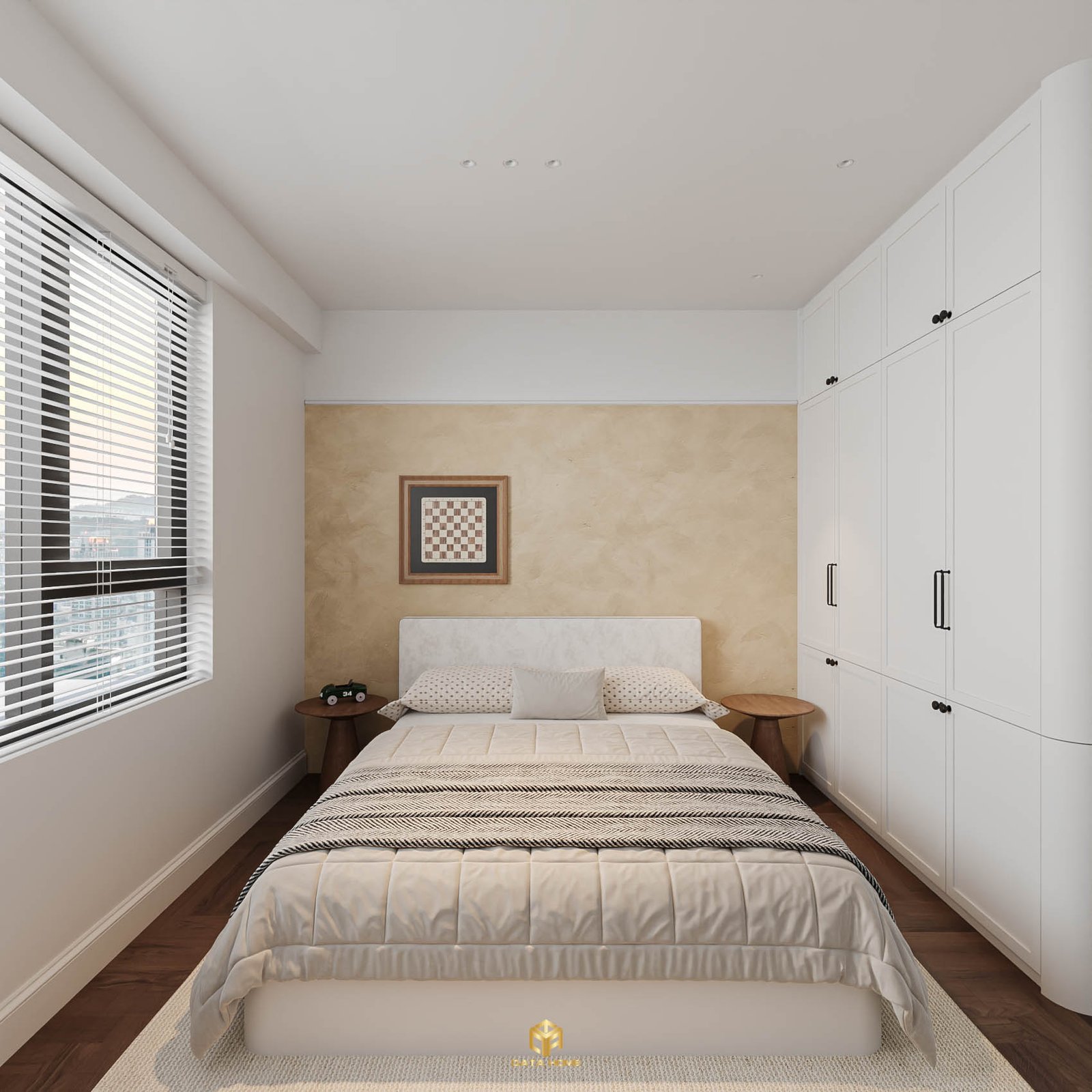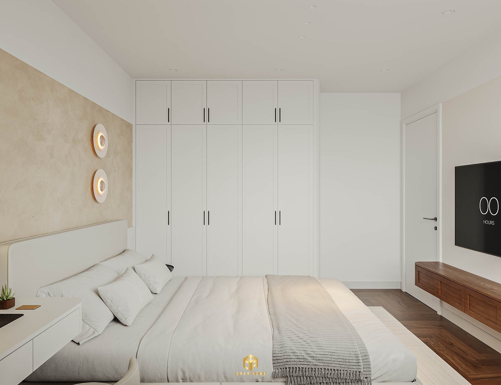 Phòng ngủ master với tủ quần áo trắng và giường bọc nệm êm ái.