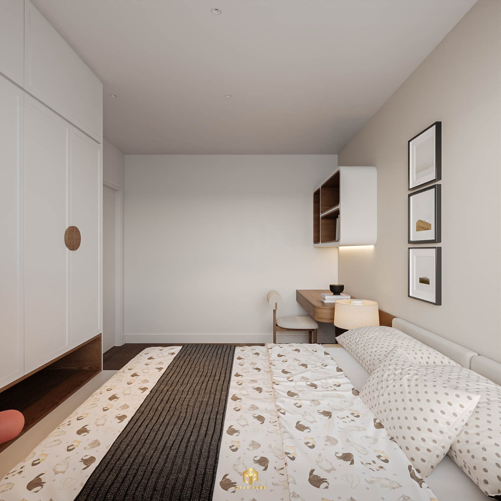 Mỗi phòng ngủ đều được chăm chút riêng. Giường bọc vải trắng, chăn ga họa tiết dễ thương, tủ quần áo âm tường khổng lồ và bàn làm việc tích hợp kệ treo tường. Một phòng ngủ còn có giường tầng và thảm hình gấu sư tử vui nhộn – hoàn hảo cho gia đình có con nhỏ.