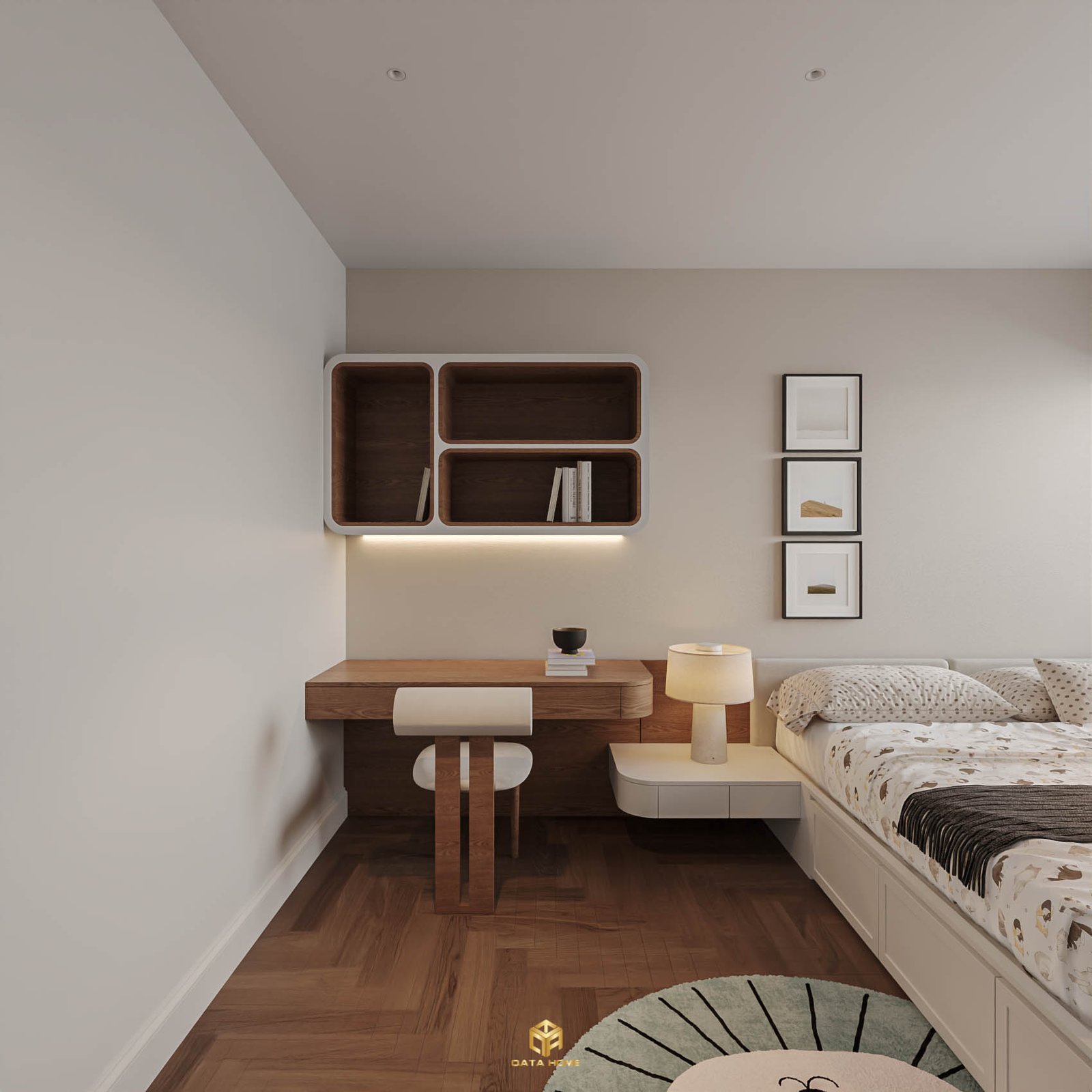 Góc phòng ngủ với bàn làm việc và kệ treo tường – giải pháp thông minh cho không gian nhỏ.