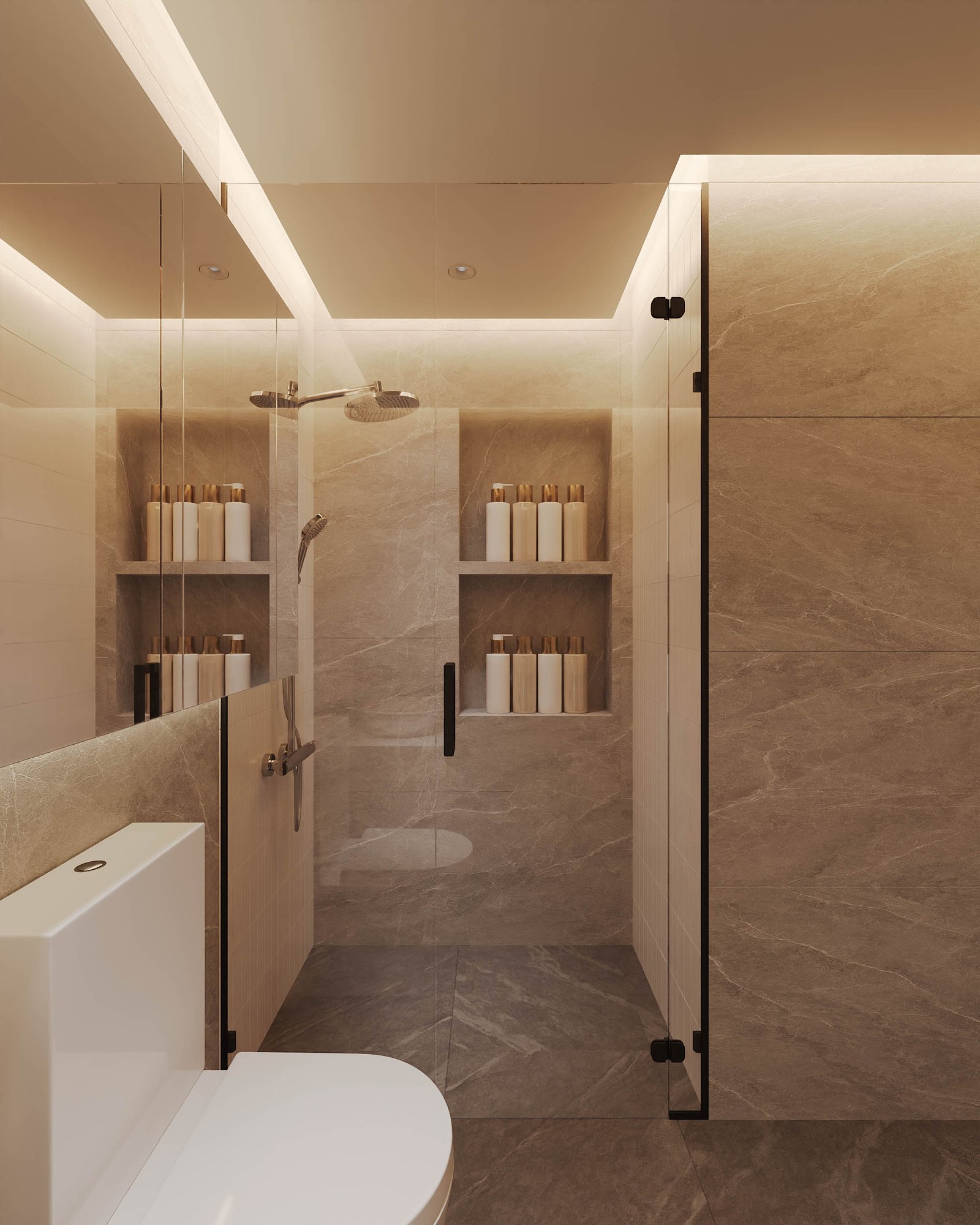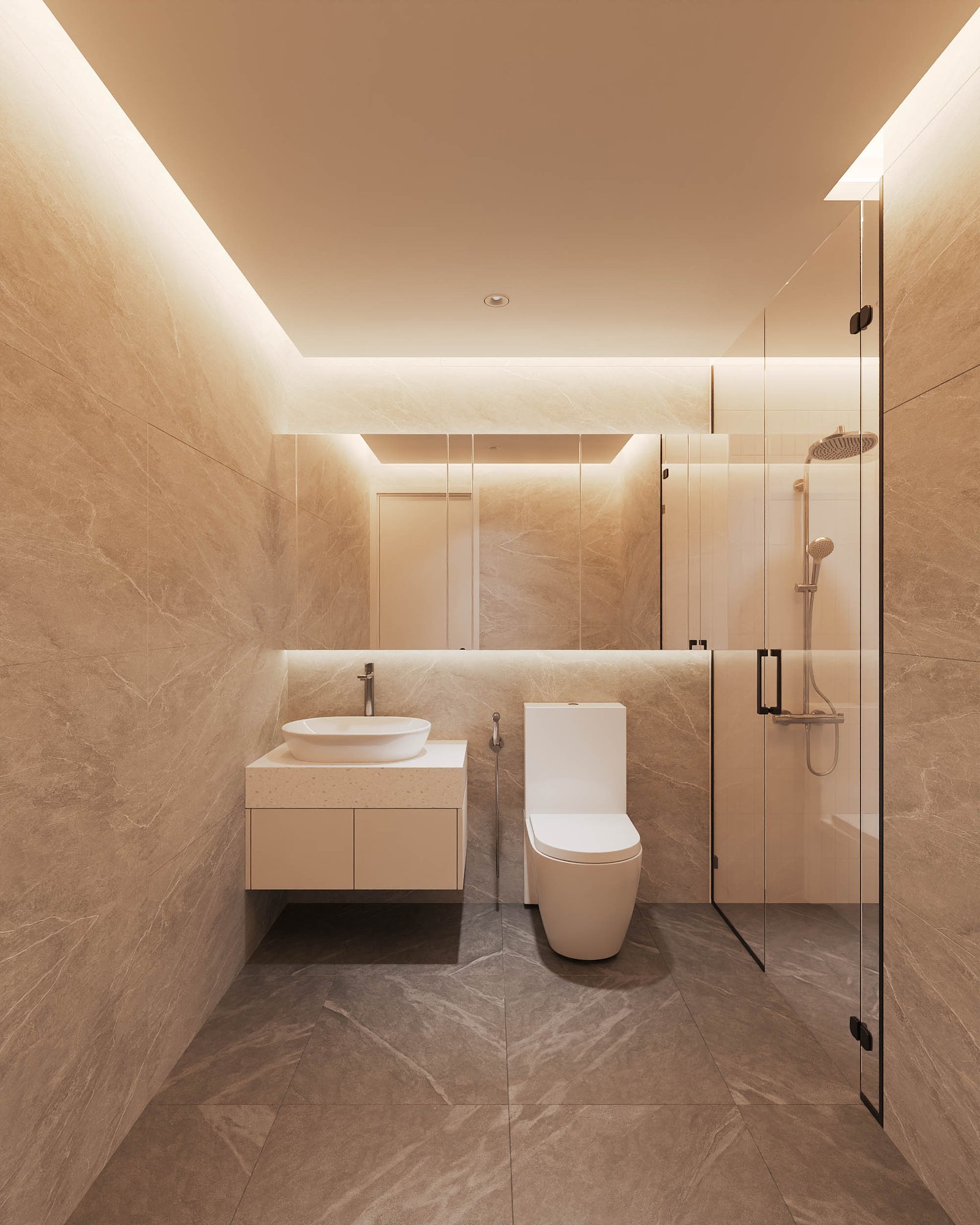 Phòng tắm sử dụng gạch marble nâu nhạt, vòi sen mưa cao cấp, lavabo hình oval và gương LED viền sáng. Không gian kín đáo nhưng vẫn tràn ngập ánh sáng tự nhiên.