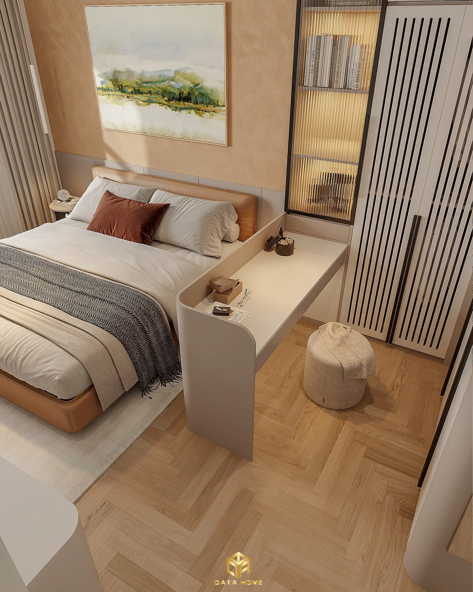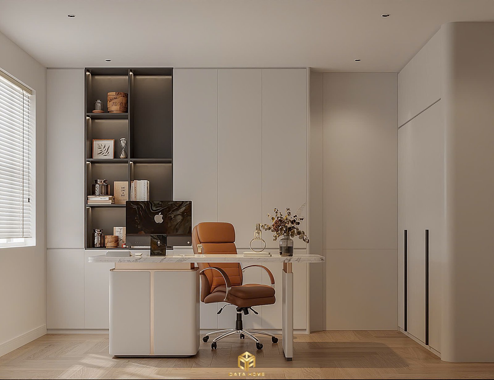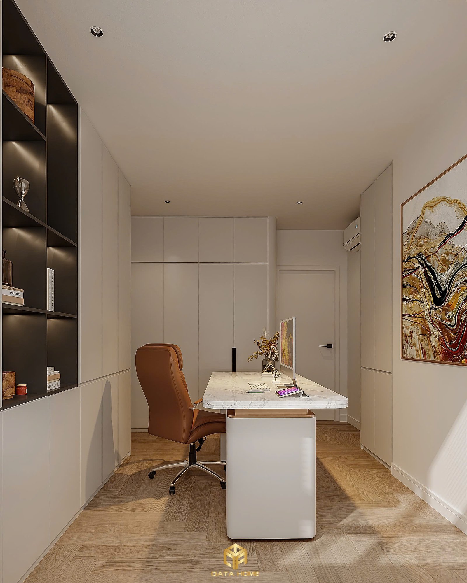 Khu vực làm việc được thiết kế theo phong cách tối giản hiện đại, ưu tiên sự tinh gọn và cảm giác thoáng đãng. Bàn làm việc với mặt đá sáng màu kết hợp chân bàn bo tròn tạo điểm nhấn mềm mại, đồng thời mang lại sự chắc chắn và sang trọng. Ghế da tông nâu ấm không chỉ tạo sự tương phản nhẹ nhàng với tổng thể màu trung tính mà còn tăng cảm giác êm ái, thoải mái khi sử dụng trong thời gian dài.