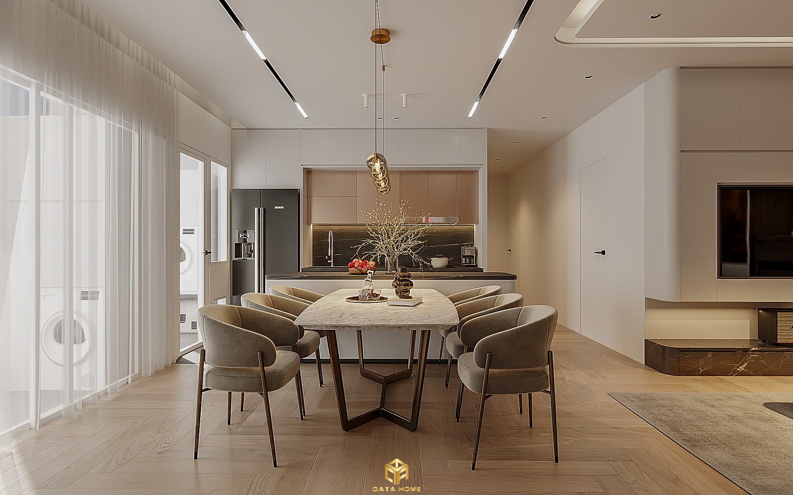 Bàn ăn với thiết kế hiện đại, chân kim loại thanh mảnh kết hợp ghế bọc nỉ mang lại cảm giác nhẹ nhàng và thanh lịch. Đèn thả trần phía trên bàn ăn không chỉ cung cấp ánh sáng mà còn đóng vai trò như một điểm nhấn trang trí.