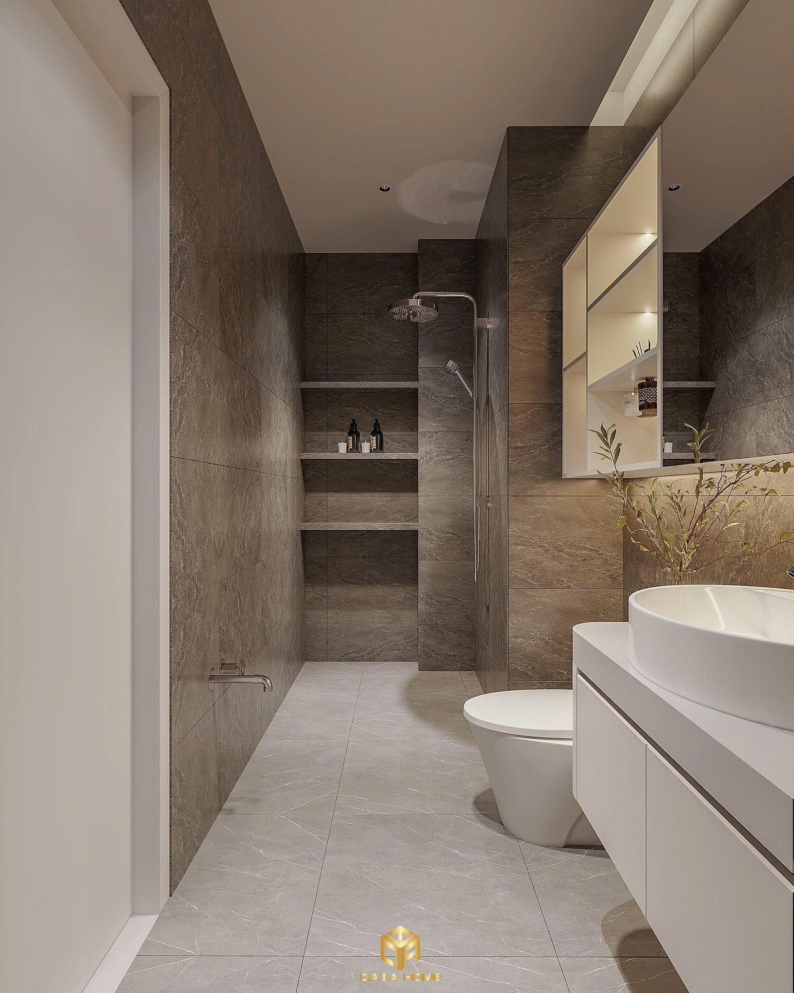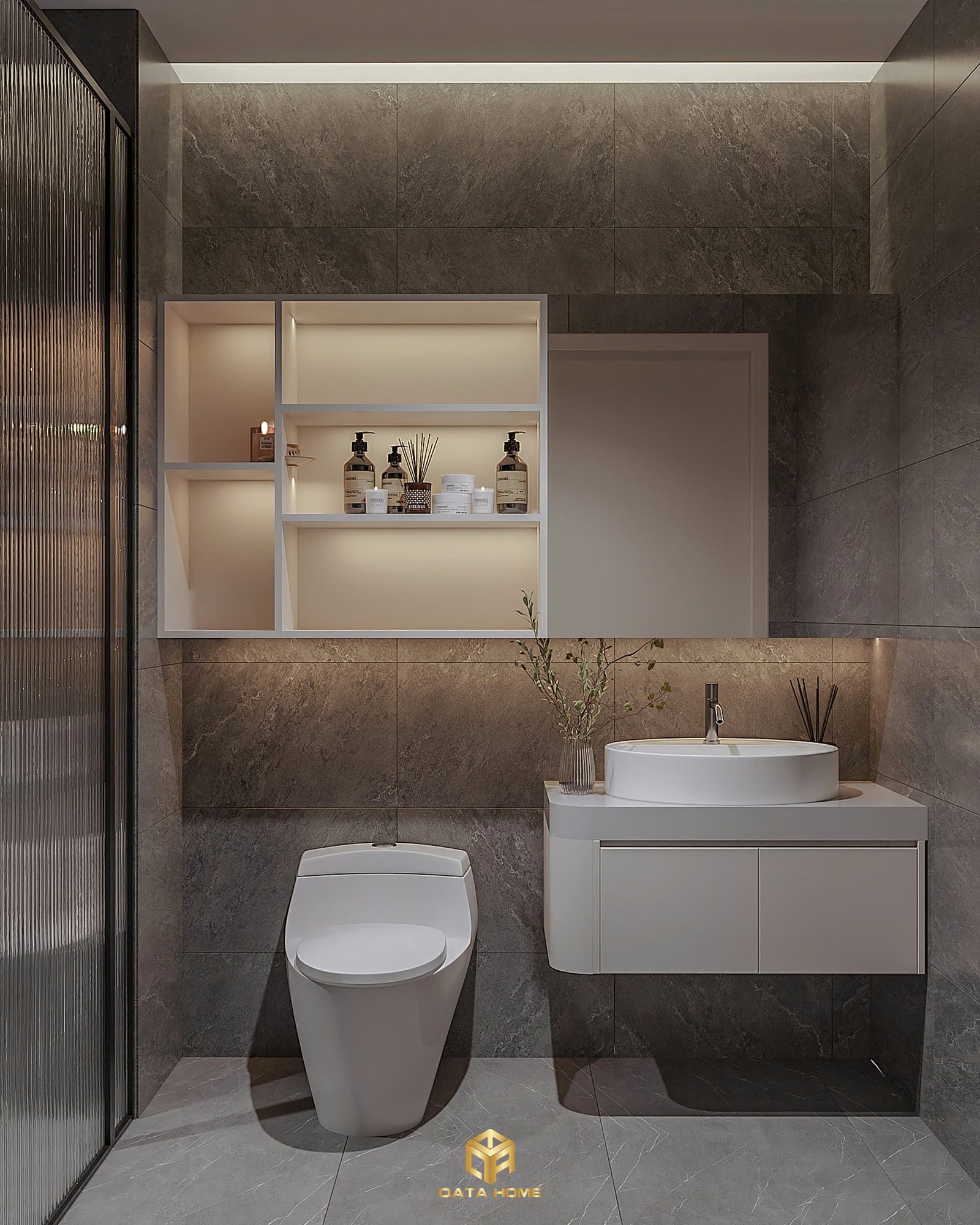 Phòng tắm với thiết kế tối giản, vật liệu đá và ánh sáng tinh tế đúng chuẩn thiết kế nội thất hiện đại.