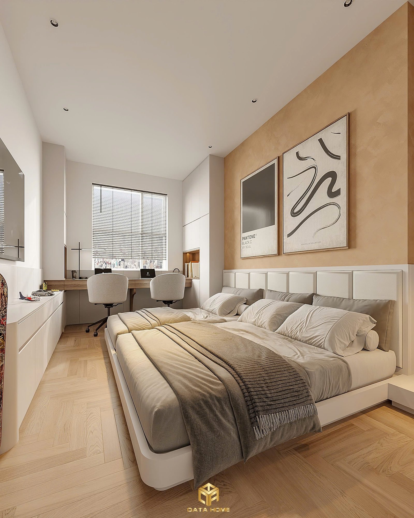 Gam màu trung tính kết hợp ánh sáng tự nhiên từ cửa sổ lớn mang lại cảm giác thư giãn. Khu vực bàn làm việc được bố trí sát cửa sổ, tận dụng tối đa nguồn sáng tự nhiên.