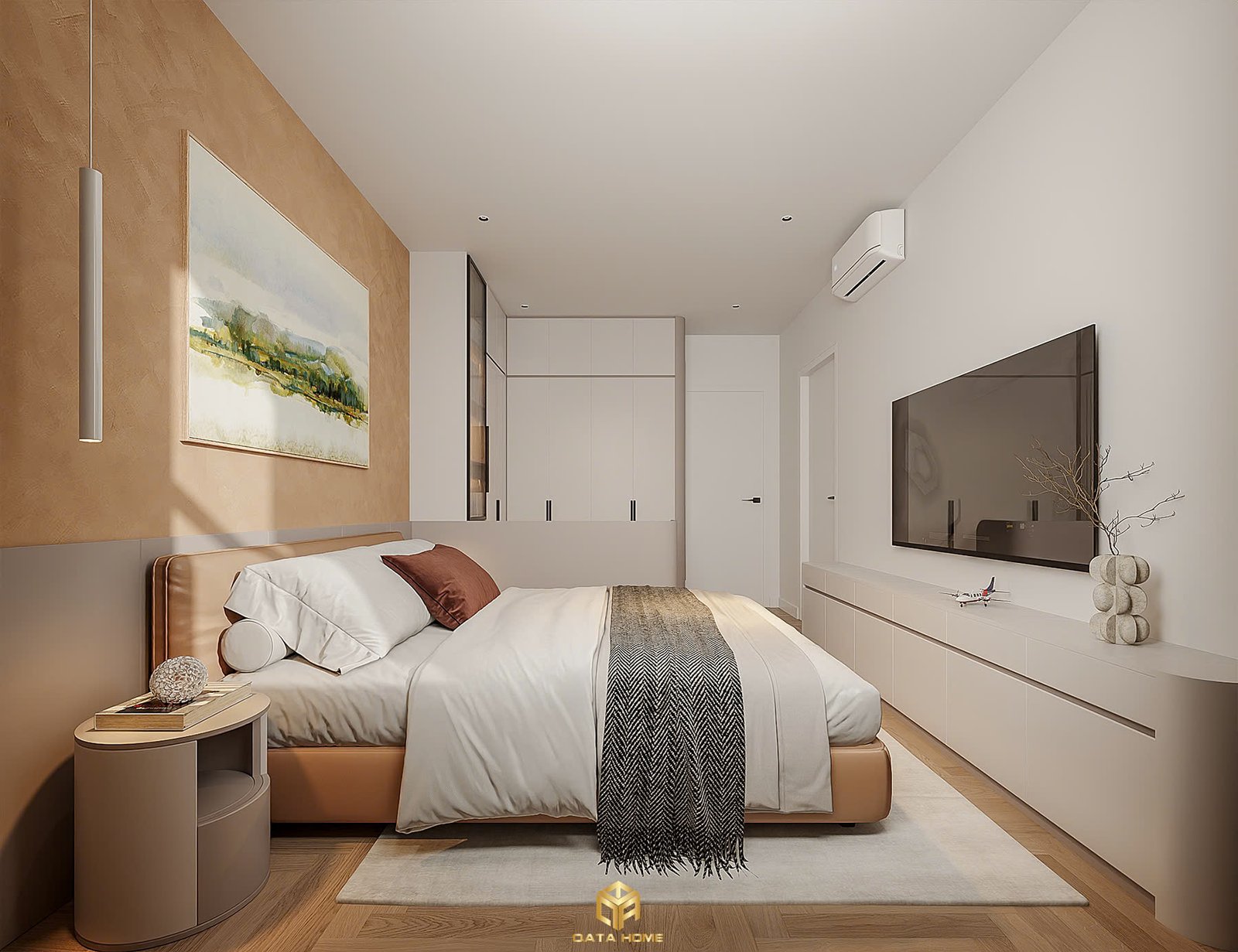 Phòng ngủ được thiết kế theo hướng tối giản nhưng vẫn đảm bảo sự ấm cúng. Giường ngủ thấp, tab đầu giường gọn gàng cùng hệ tủ âm tường giúp tiết kiệm diện tích.