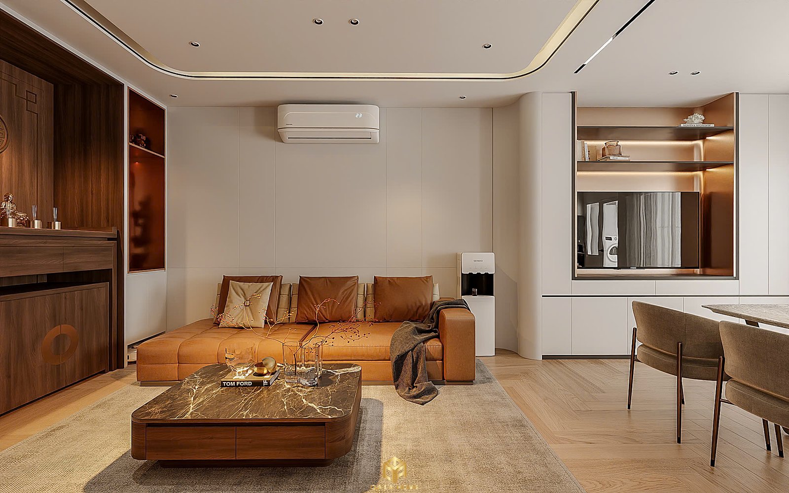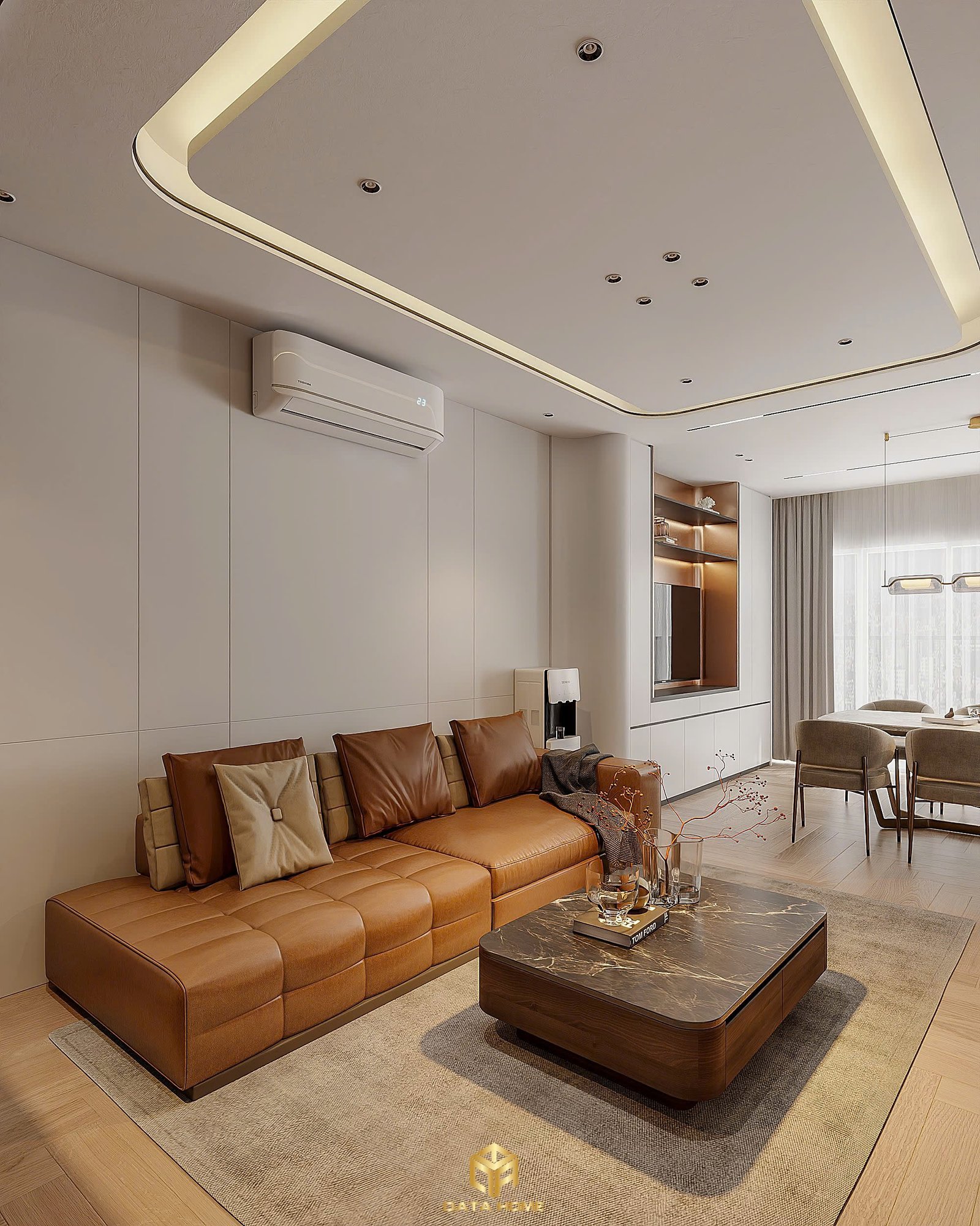 Phòng khách là nơi thể hiện rõ nhất tinh thần của thiết kế nội thất hiện đại. Bộ sofa da nâu trầm mang lại cảm giác ấm áp, kết hợp cùng bàn trà đá vân mây tạo điểm nhấn tinh tế. Hệ tủ kệ tivi được thiết kế âm tường giúp tối ưu diện tích, đồng thời tạo nên sự gọn gàng, ngăn nắp.