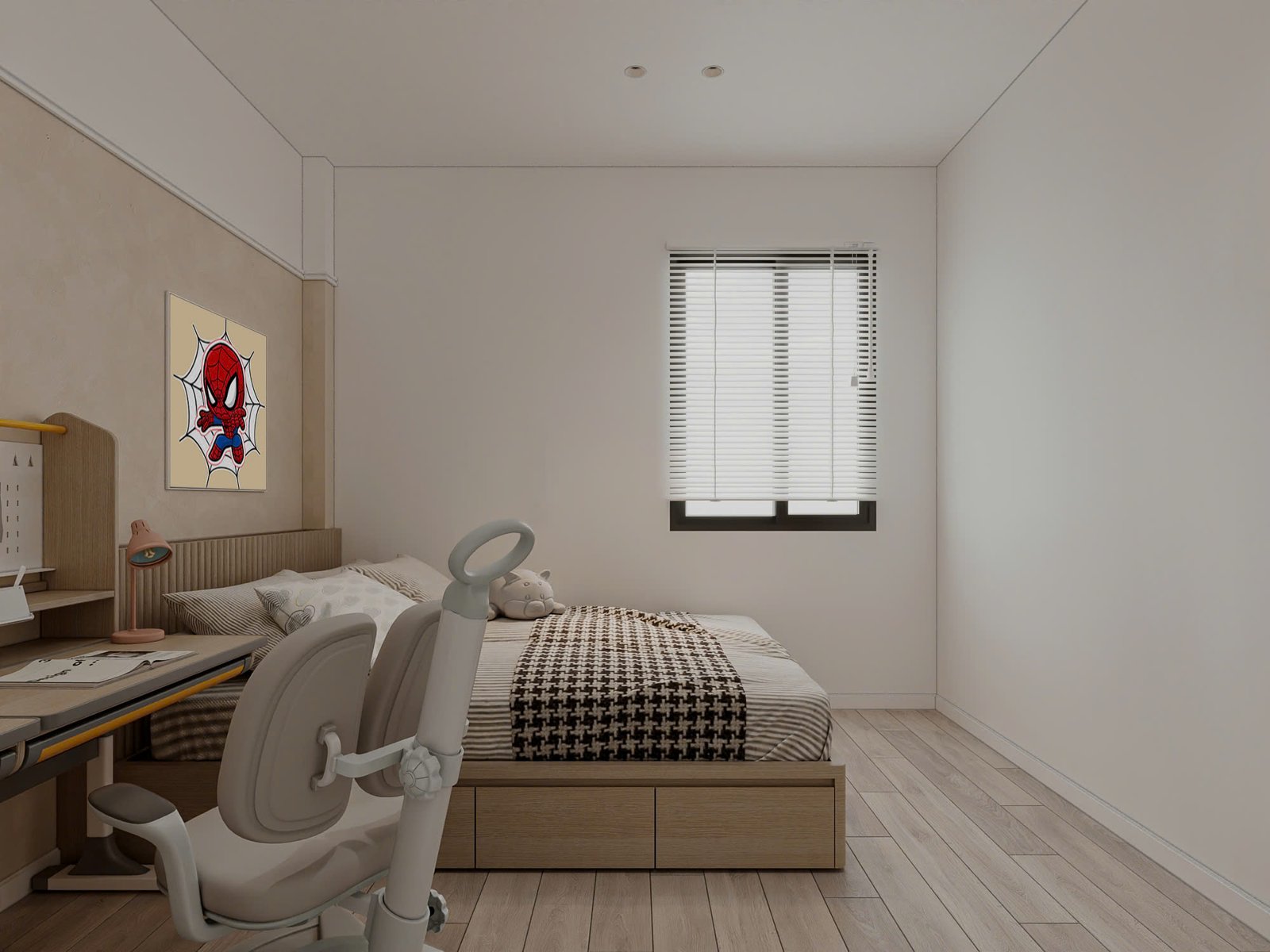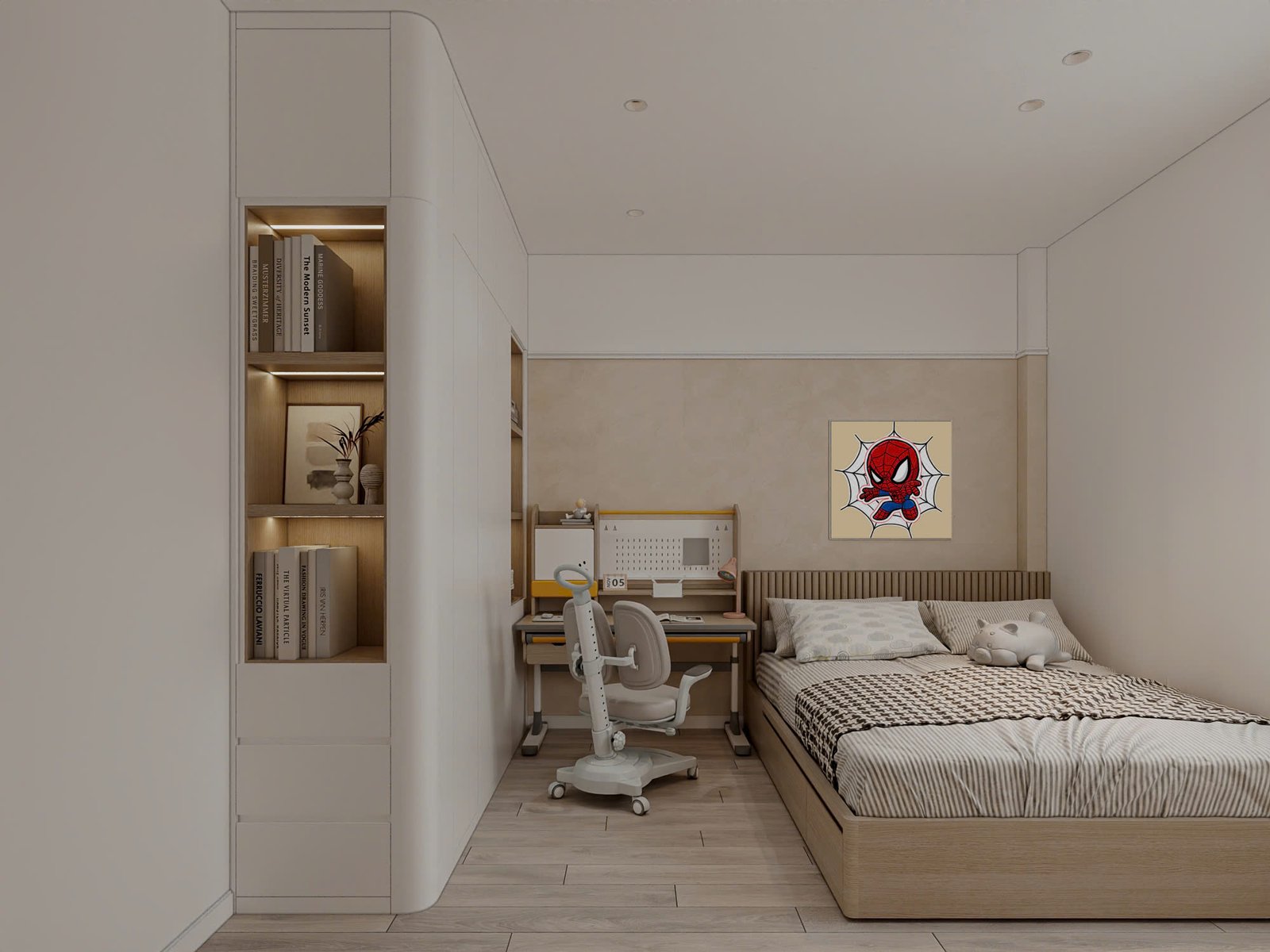 Phòng ngủ phụ được thiết kế dành cho con cái với giường tầng thông minh, bàn học tích hợp kệ sách và ghế xoay ergonomic. Góc làm việc riêng tư với bàn gỗ veneer, ghế bọc vải và giá sách mở giúp không gian vừa gọn gàng vừa truyền cảm hứng học tập. Màu sắc trung tính kết hợp điểm nhấn tranh nghệ thuật tạo nên môi trường lý tưởng cho sự phát triển.