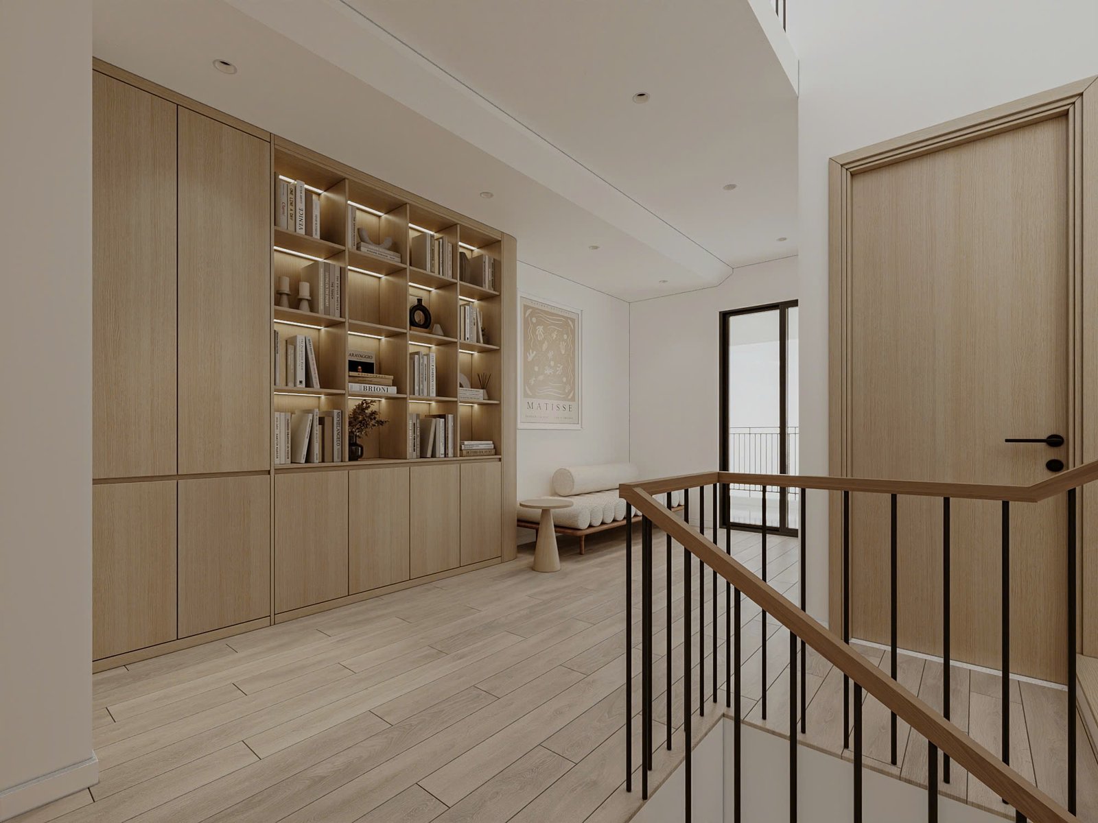 Cầu thang được thiết kế như một tác phẩm nghệ thuật với bậc gỗ óc chó kết hợp lan can sắt thanh mảnh đen bóng. Vách ngăn gỗ dọc chạy dọc cầu thang vừa làm điểm nhấn kiến trúc vừa dẫn dắt ánh mắt lên tầng trên một cách mượt mà. Hành lang tầng lầu được ốp gỗ nhẹ nhàng, kết hợp kệ sách mở và cửa kính lớn, tạo cảm giác thông thoáng và sang trọng.