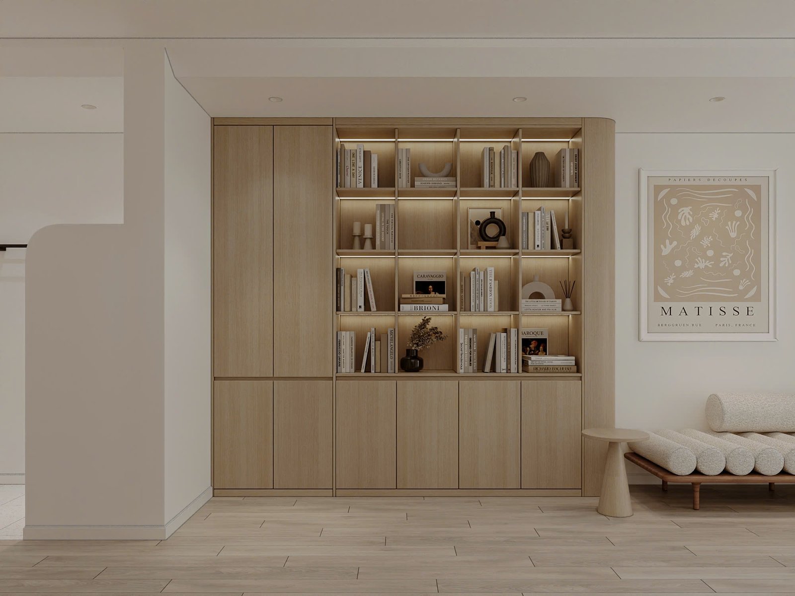 Hệ tủ kệ âm tường bằng gỗ sáng kết hợp đèn hắt tạo điểm nhấn ấm áp và tinh tế cho không gian.