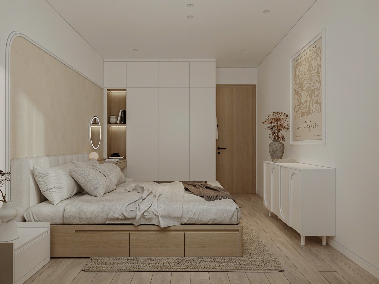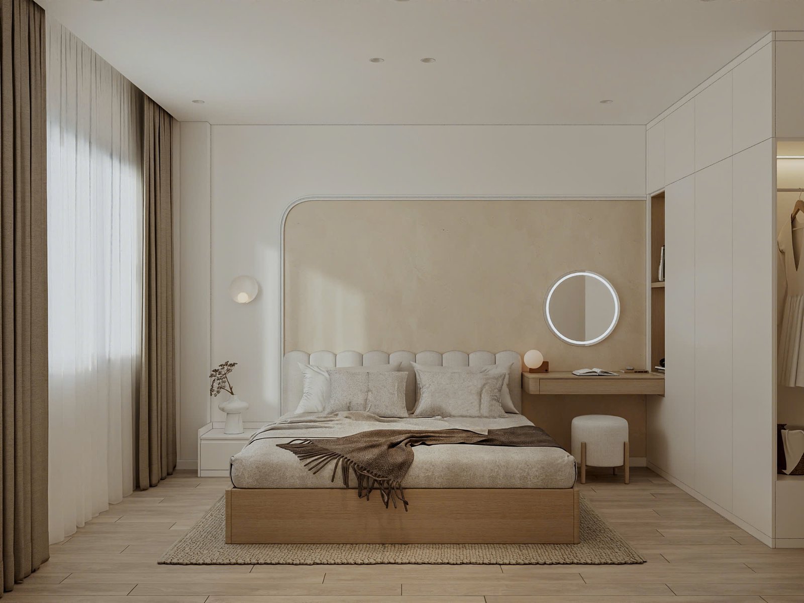 Phòng ngủ chính gây ấn tượng với đầu giường bọc vải boucle cao cấp, giường thấp hiện đại và tủ quần áo âm tường liền khối. Bức tường đầu giường được ốp panel gỗ bo cong mềm mại, kết hợp gương tròn và đèn LED gián tiếp tạo điểm nhấn ấm áp. Không gian này mang đến cảm giác thư thái, lý tưởng để tái tạo năng lượng sau ngày dài.