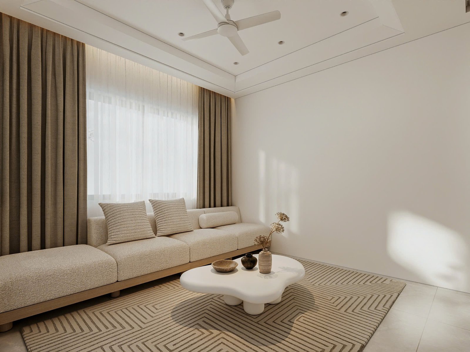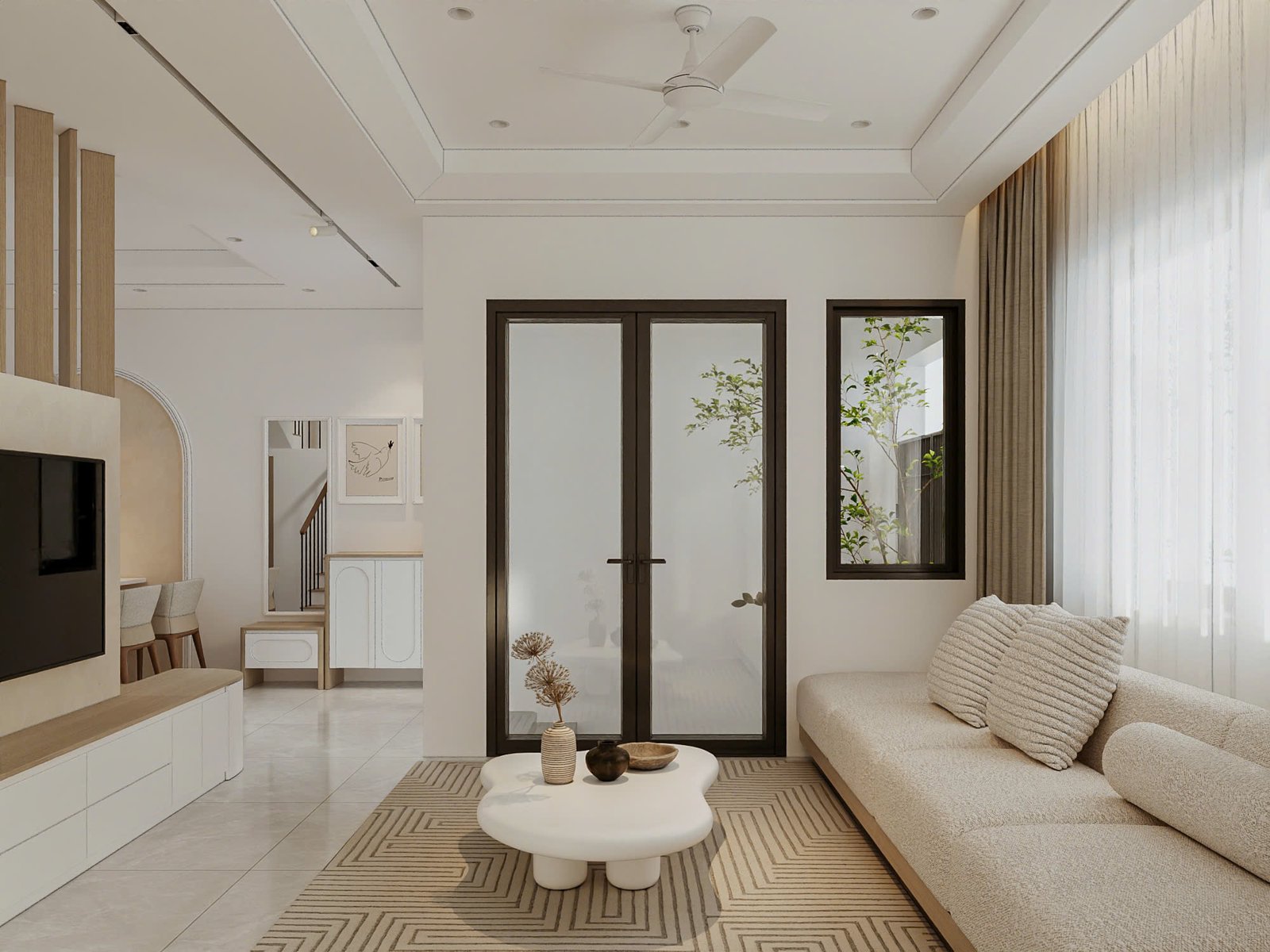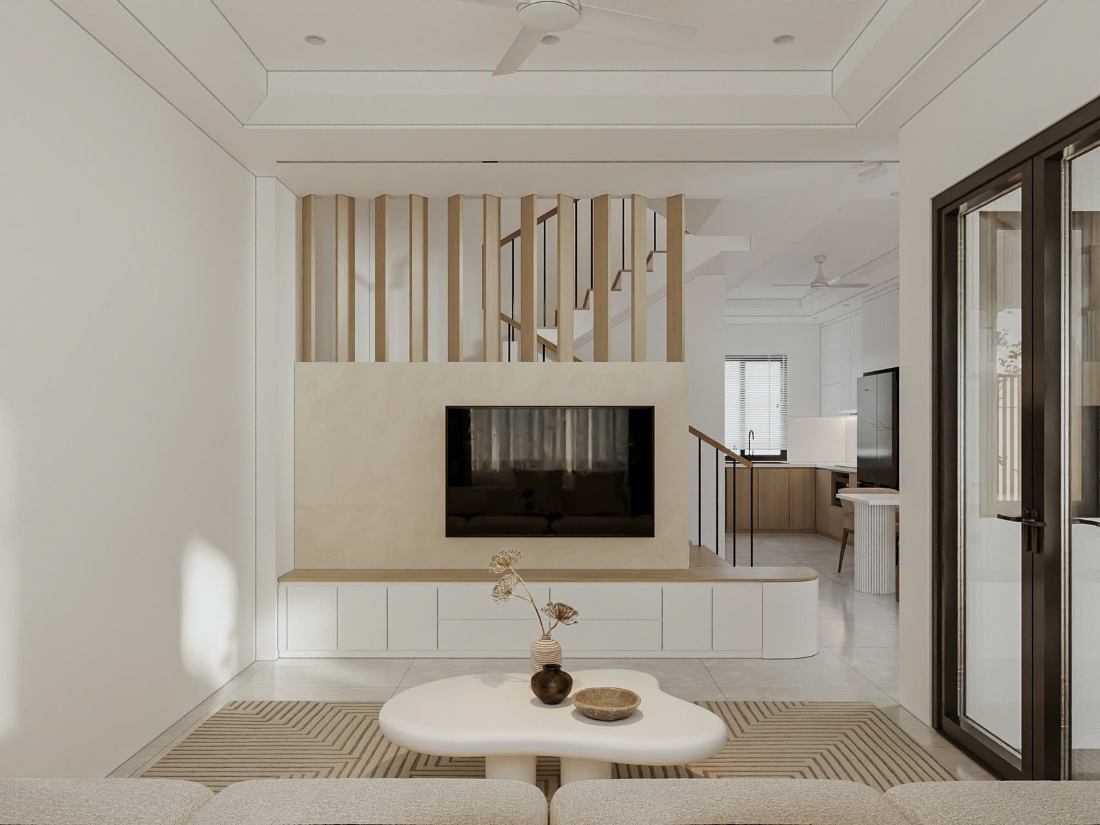 Phòng khách là trái tim của ngôi nhà với bộ sofa vải boucle màu be ấm áp, bàn trà hình đám mây trắng tinh khôi và kệ tivi được thiết kế liền khối với vách gỗ thanh đứng. Trần nhà được làm nổi khối hộp với quạt trần hiện đại, kết hợp rèm sheer lọc sáng dịu nhẹ từ cửa kính lớn. Không gian này vừa sang trọng vừa gần gũi, lý tưởng cho những buổi tối gia đình quây quần.