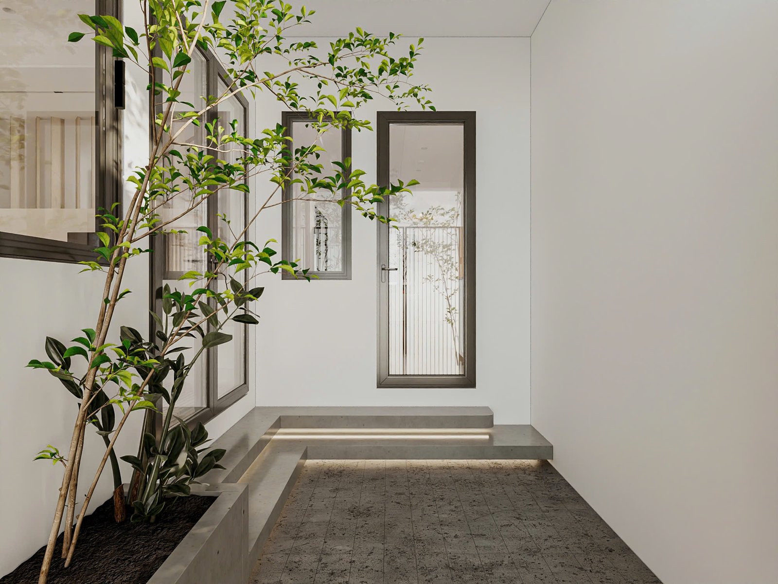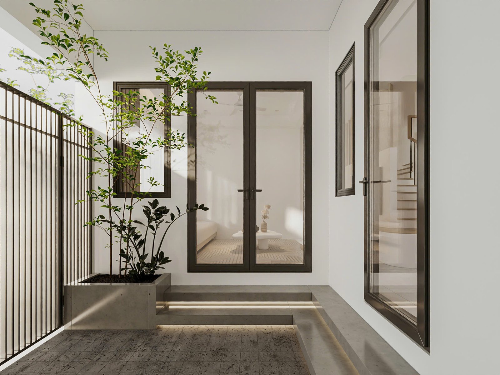 Ban công tầng lầu và sân sau nhỏ được bố trí cây xanh, chậu trồng và sàn gỗ composite, tạo góc thư giãn riêng tư. Cửa kính trượt lớn giúp kết nối không gian trong nhà với thiên nhiên, mang lại luồng gió mát và cảm giác gần gũi với cây cỏ mỗi ngày.