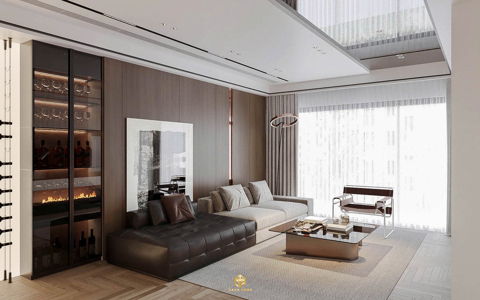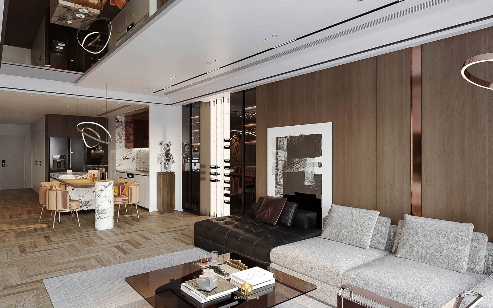Phòng khách của căn hộ được Qata Home thiết kế theo lối mở, đón trọn ánh sáng tự nhiên qua hệ cửa kính kịch trần lớn. Không gian toát lên vẻ sang trọng nhờ sự kết hợp tinh tế giữa vách nan gỗ ấm áp và gương trang trí lớn, tạo cảm giác rộng rãi vượt trội.