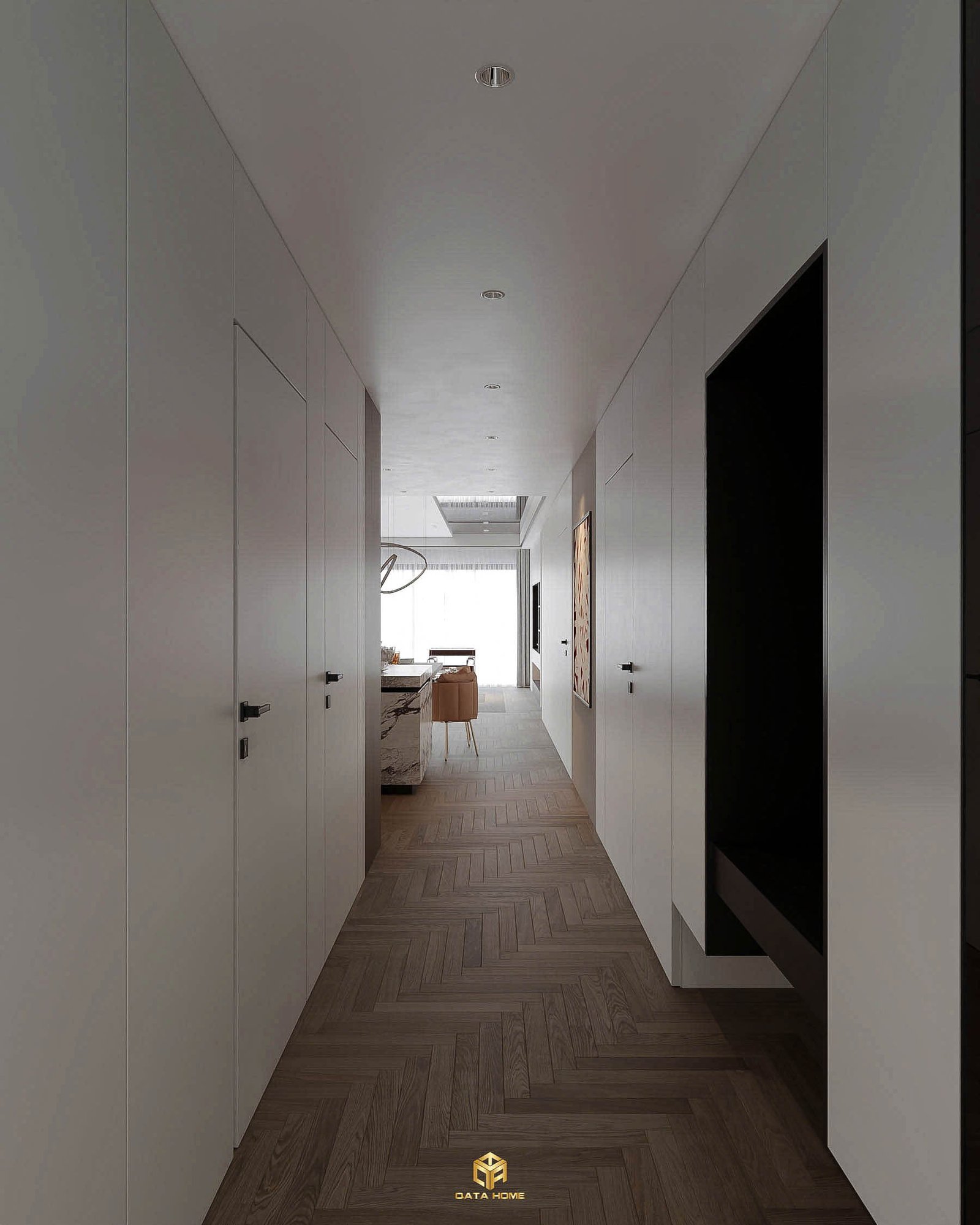 Điểm nhấn làm nên giá trị khác biệt cho căn hộ chính là ngôn ngữ thiết kế nội thất xuyên suốt các không gian. Qata Home đã khéo léo lựa chọn bảng màu trung tính đẳng cấp, sử dụng tông màu nâu gỗ óc chó ấm áp làm chủ đạo, kết hợp hài hòa cùng các mảng tường màu be sáng và ghi xám tinh tế.