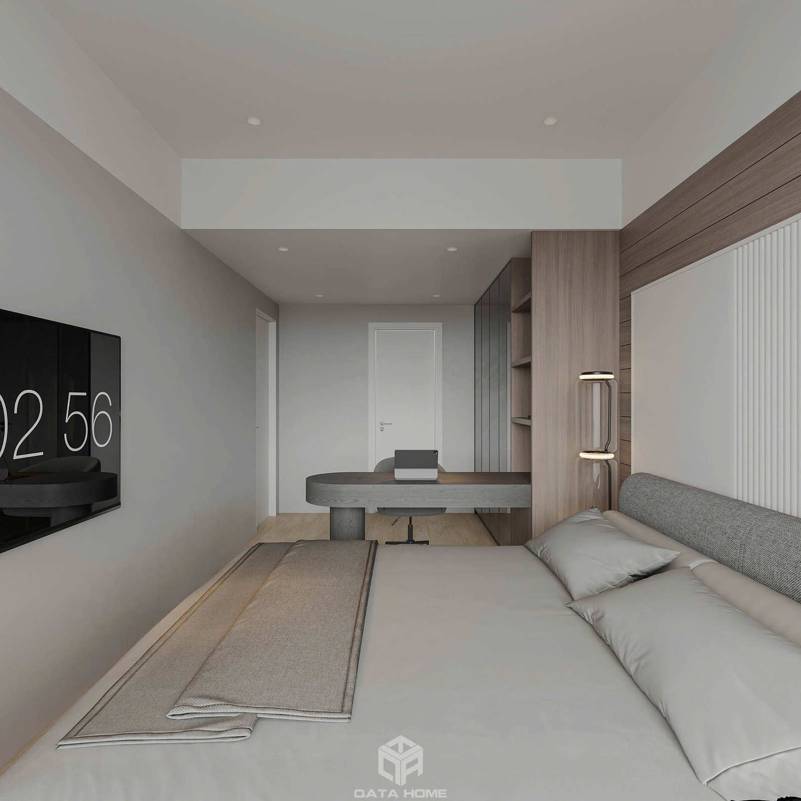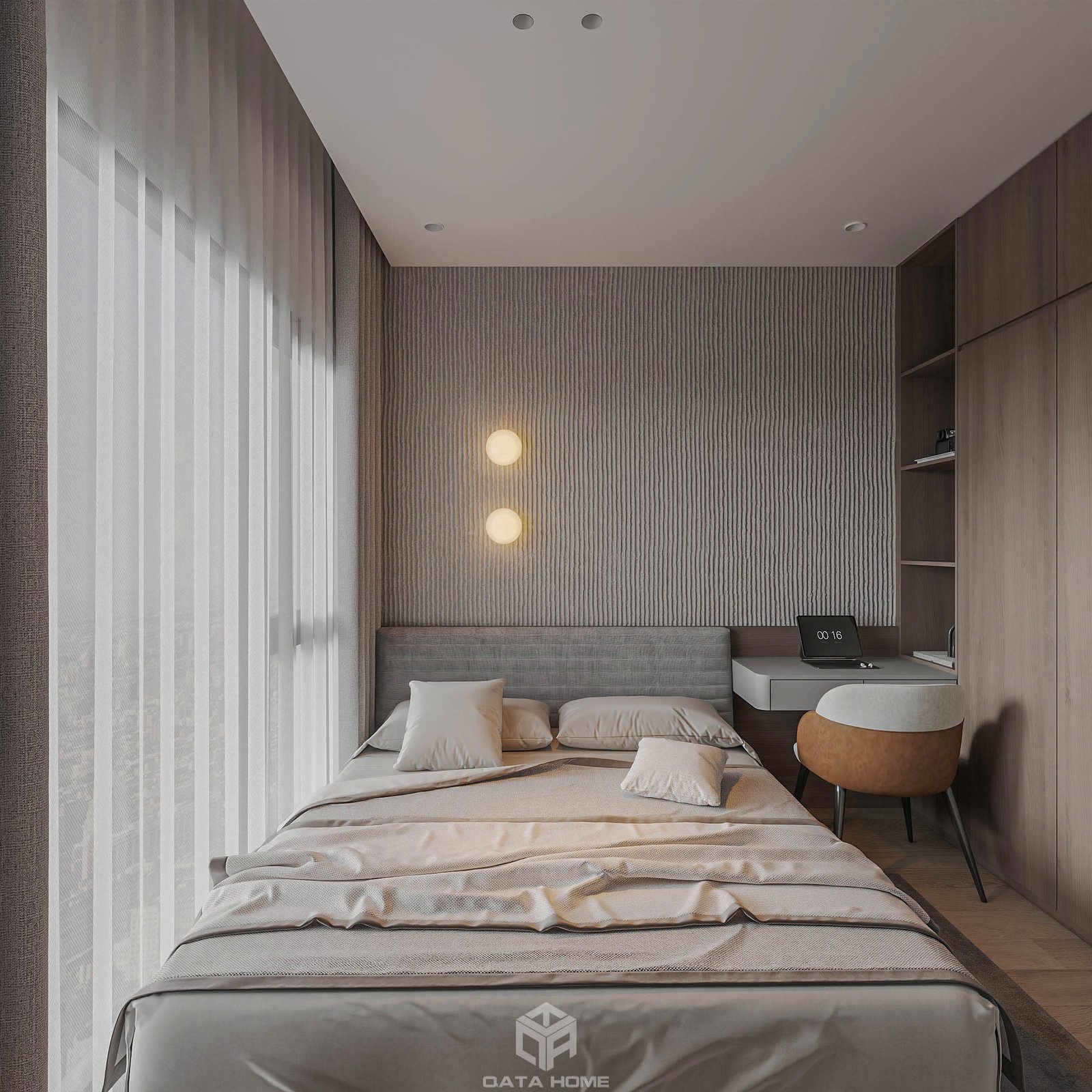 Phòng ngủ phụ hiện đại ấm áp với tông màu trung tính, ánh sáng tự nhiên và góc làm việc nhỏ gọn tiện nghi.