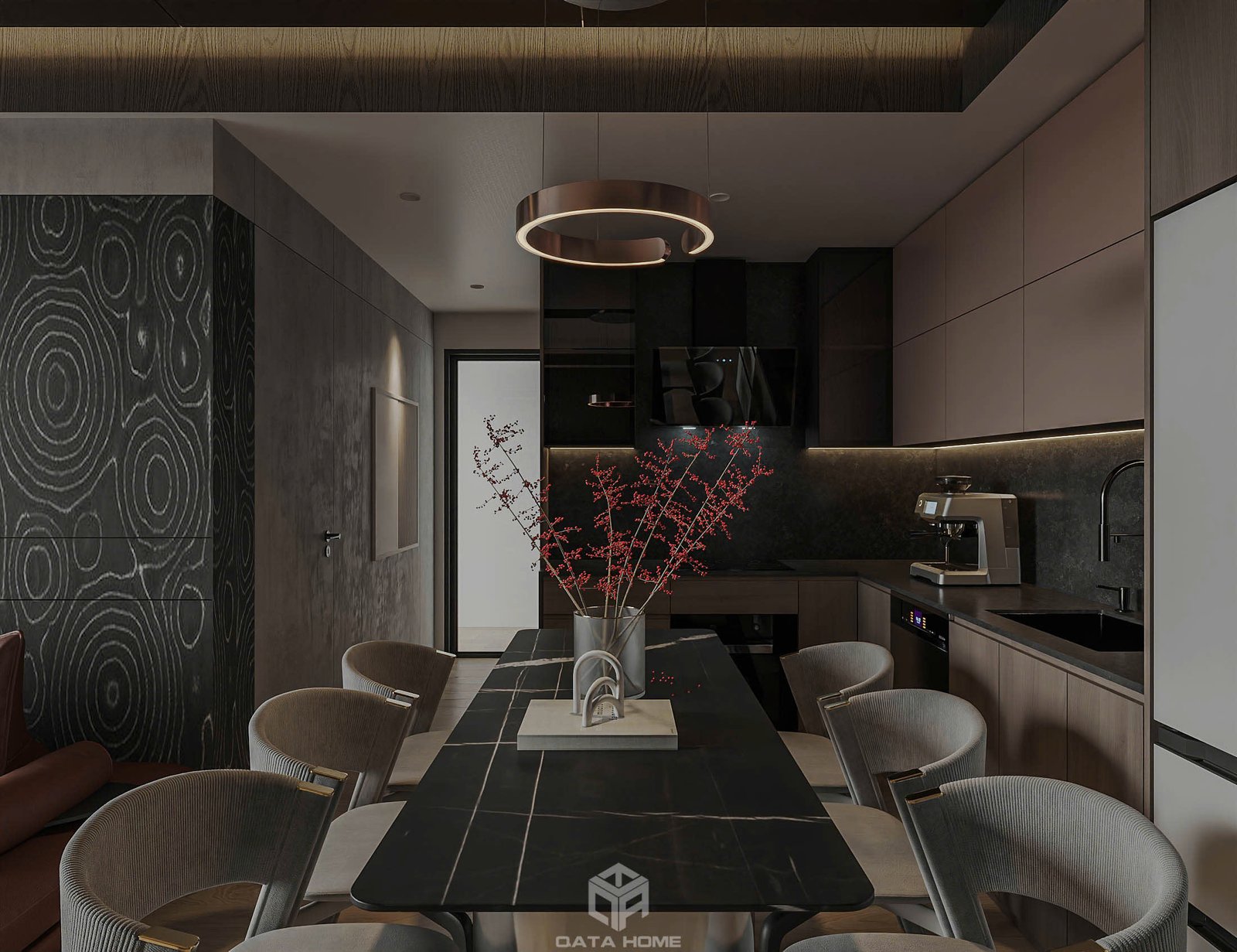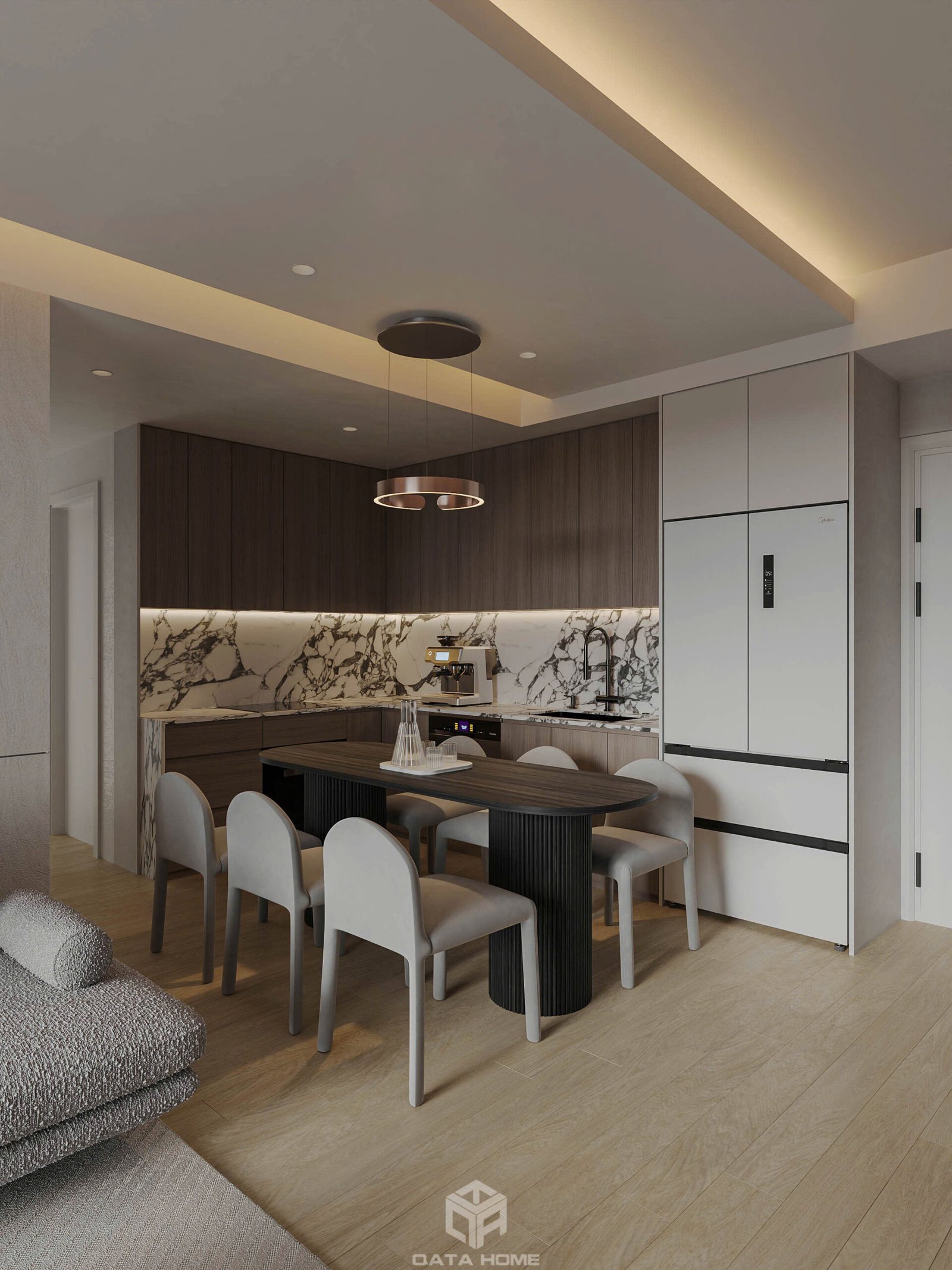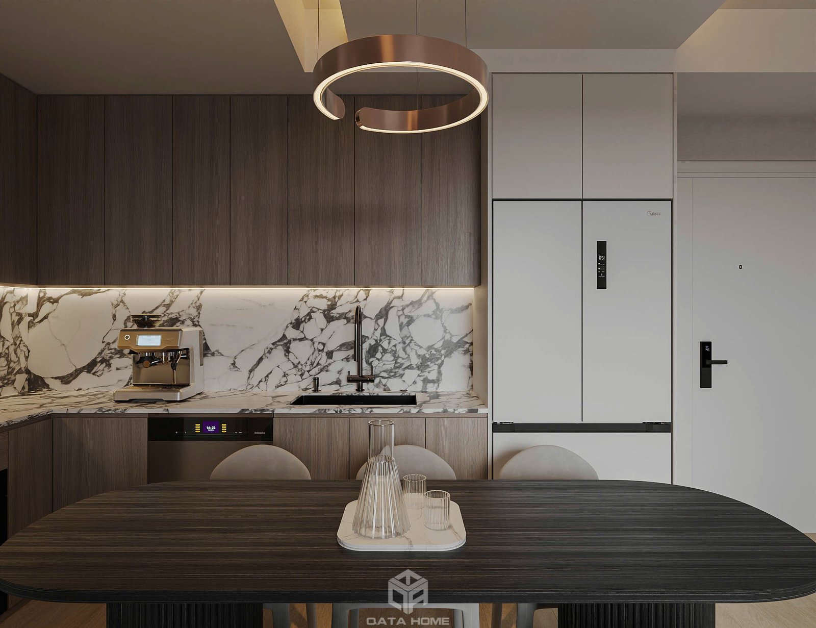Thiết kế nội thất Lumiere Boulevard thể hiện rõ nhất ở khu vực bếp – nơi Qata Home biến không gian chức năng thành điểm nhấn thẩm mỹ. Bếp chữ L với mặt đá marble trắng vân xám sang trọng, kết hợp tủ gỗ tối màu hiện đại. Máy pha cà phê cao cấp và vòi nước đen matte tạo cảm giác chuyên nghiệp như một quán café mini ngay tại nhà.