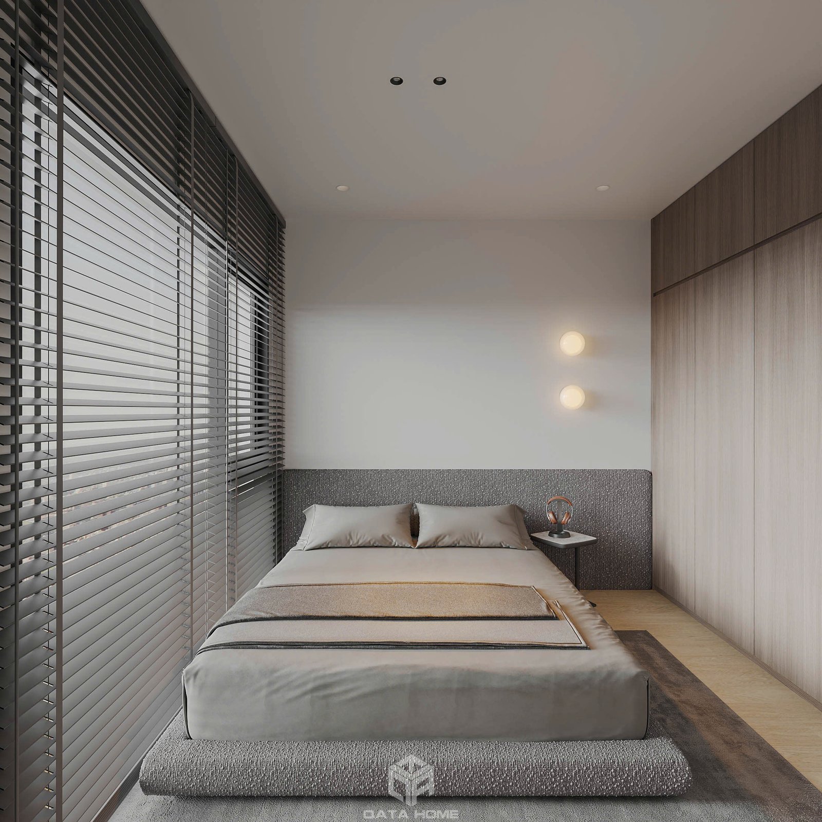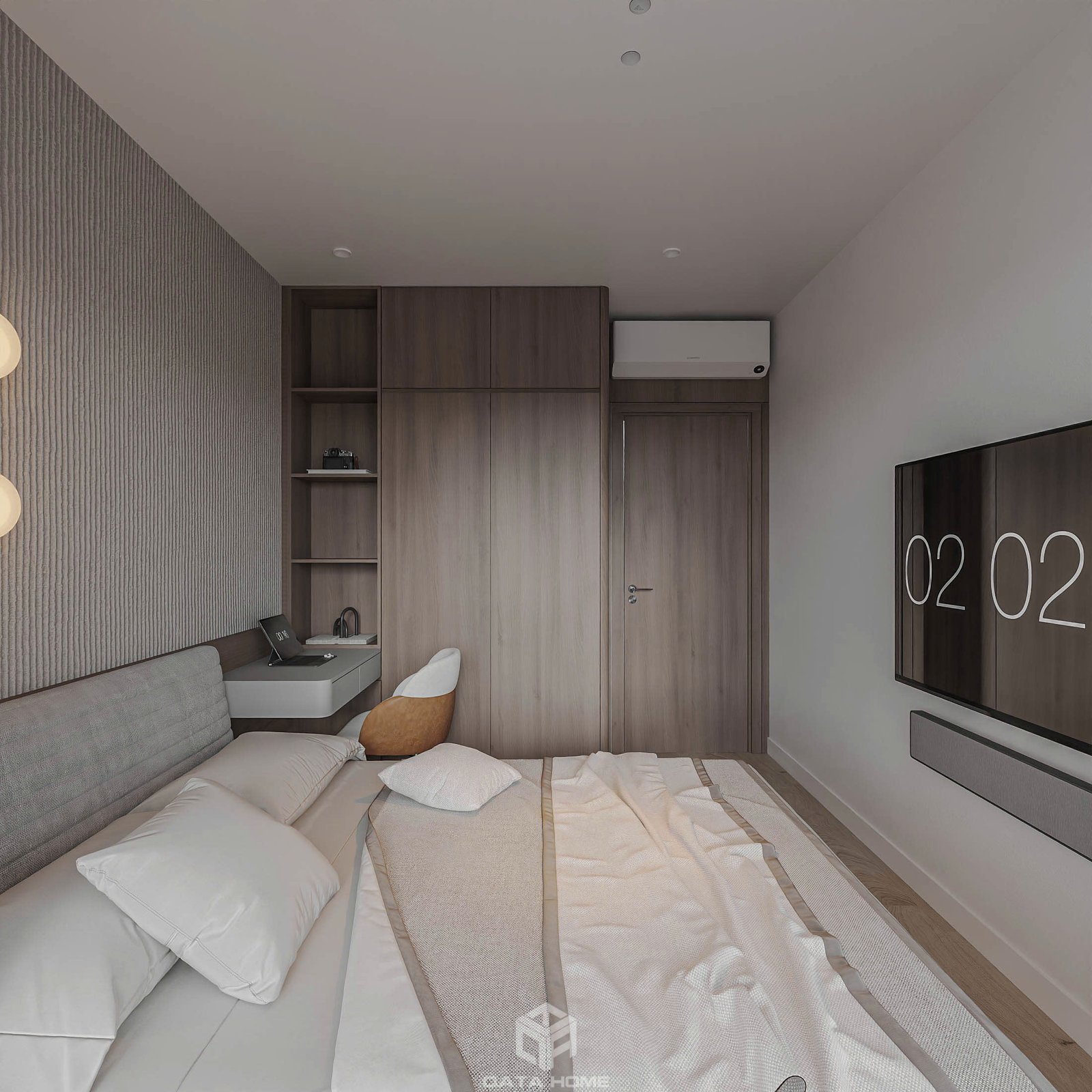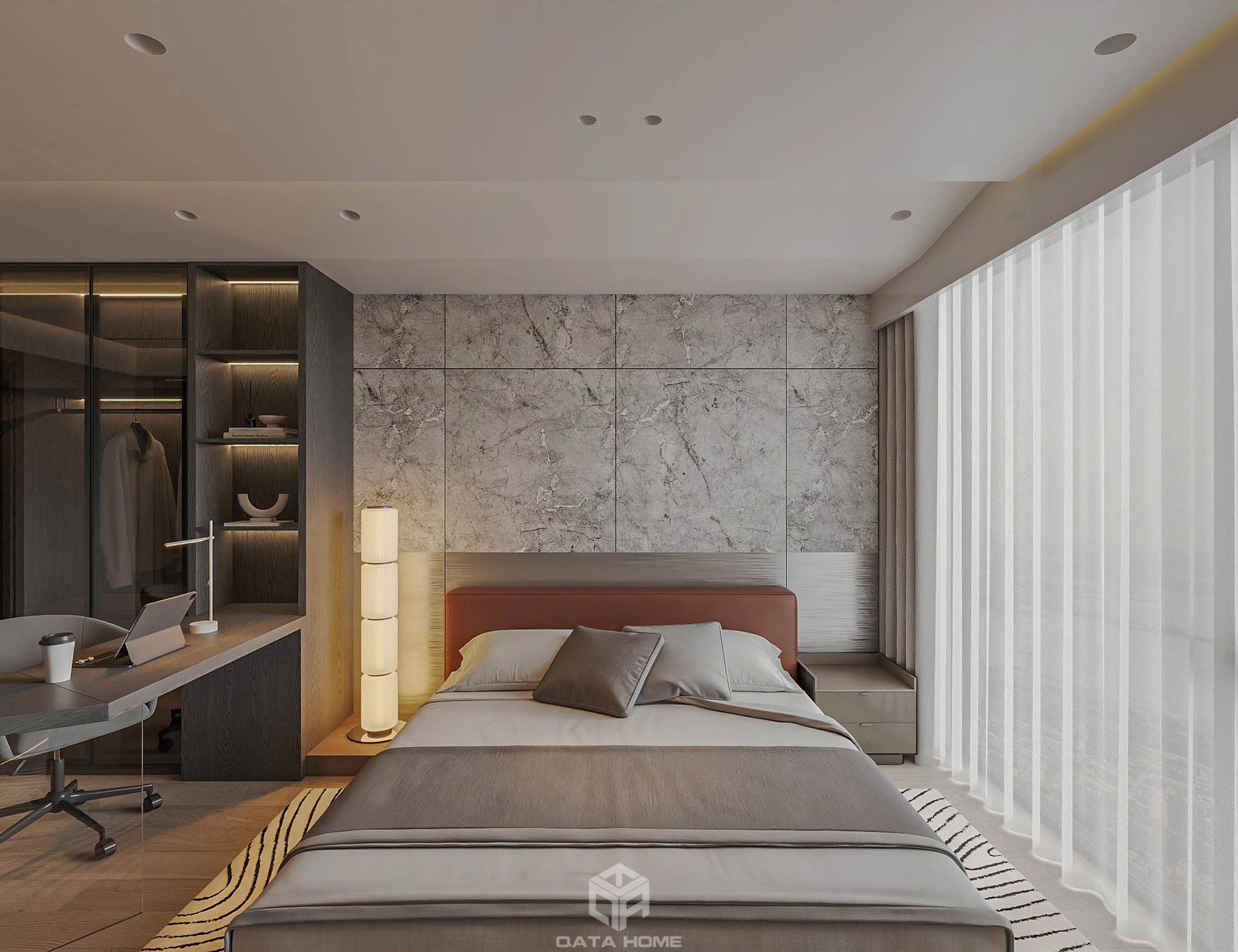 Phòng ngủ master được Qata Home chăm chút với giường đầu giường da cam ấm áp, kết hợp tủ quần áo kính đen sang trọng và bàn làm việc tích hợp. Đèn sàn cao tầng và ánh sáng LED gián tiếp tạo cảm giác thư giãn tối đa.