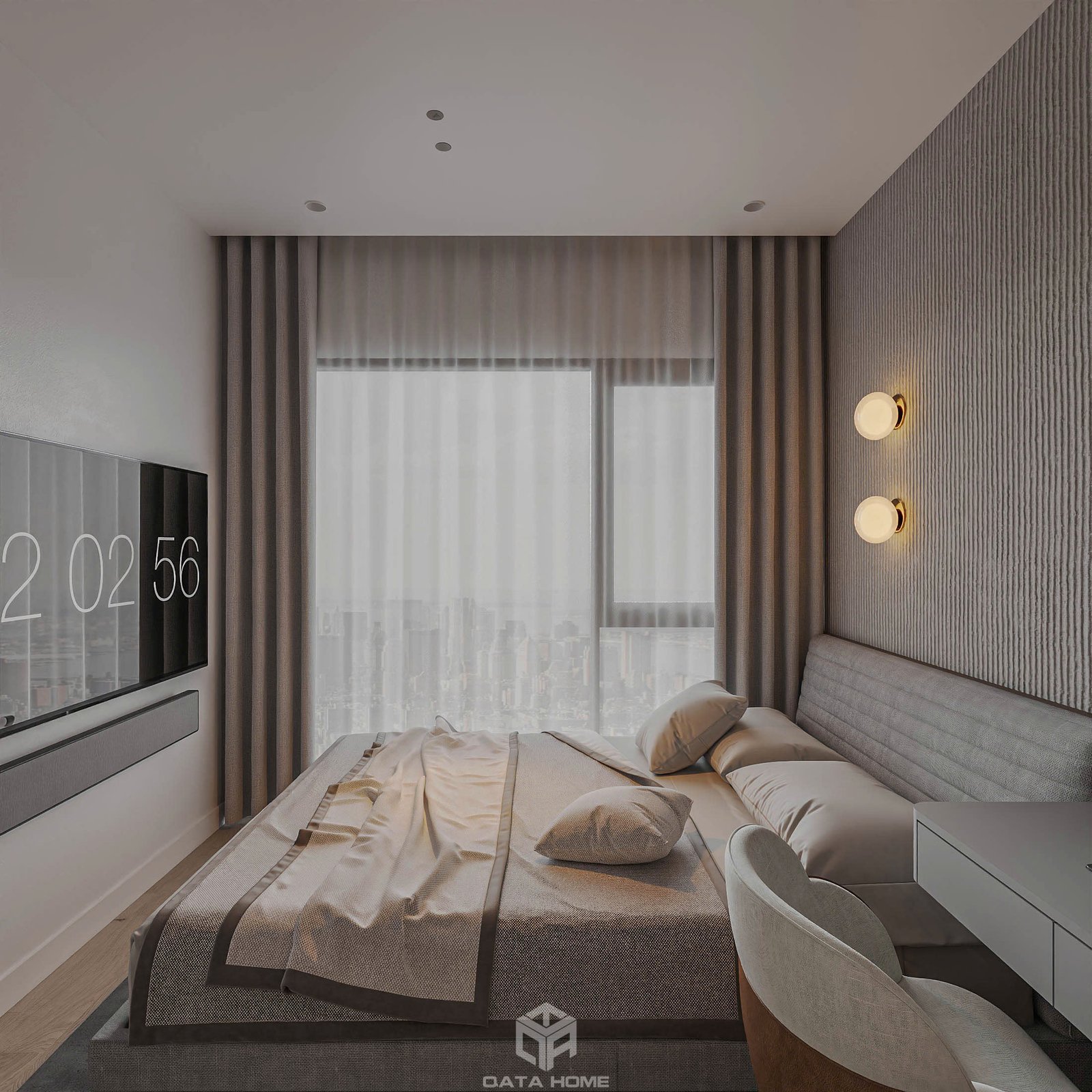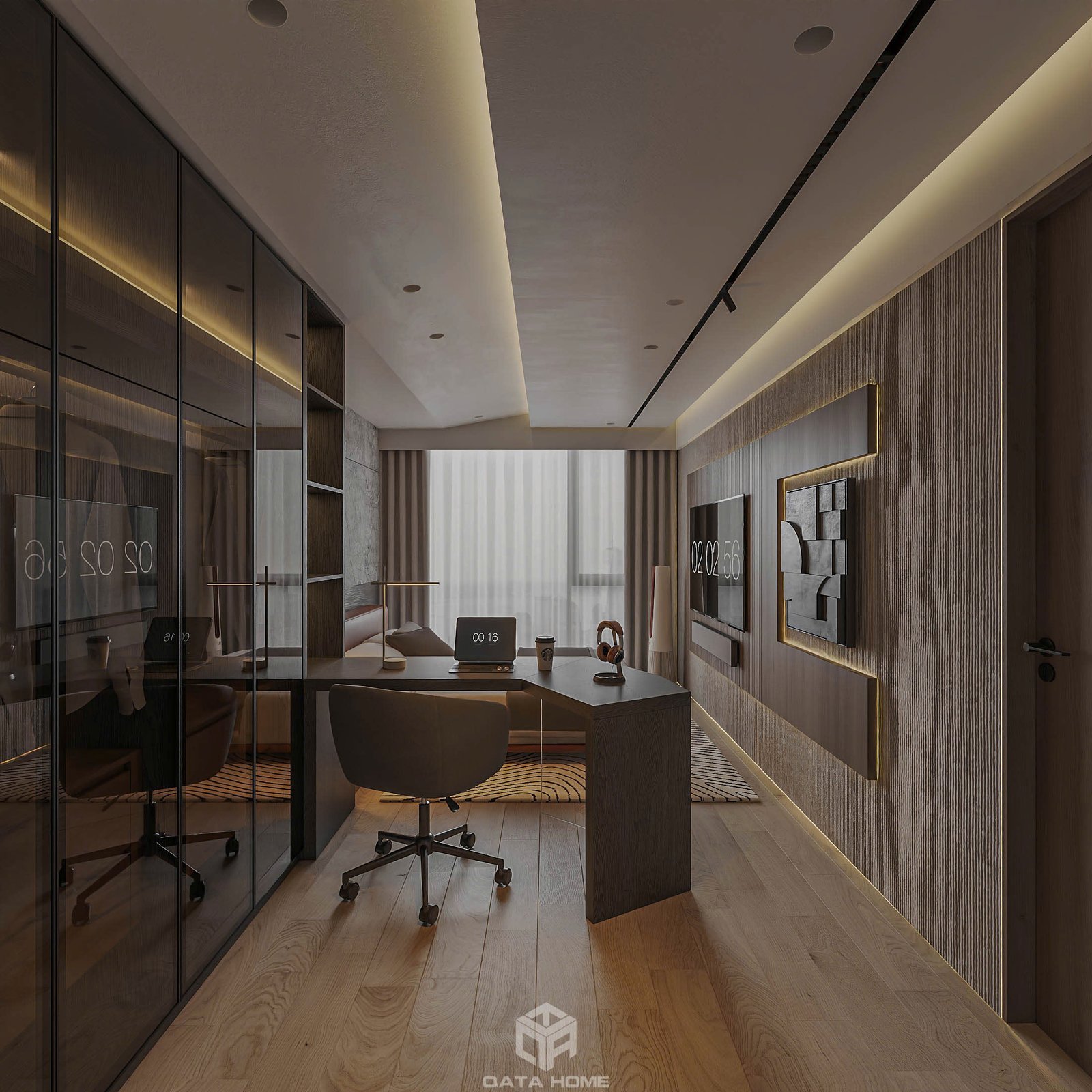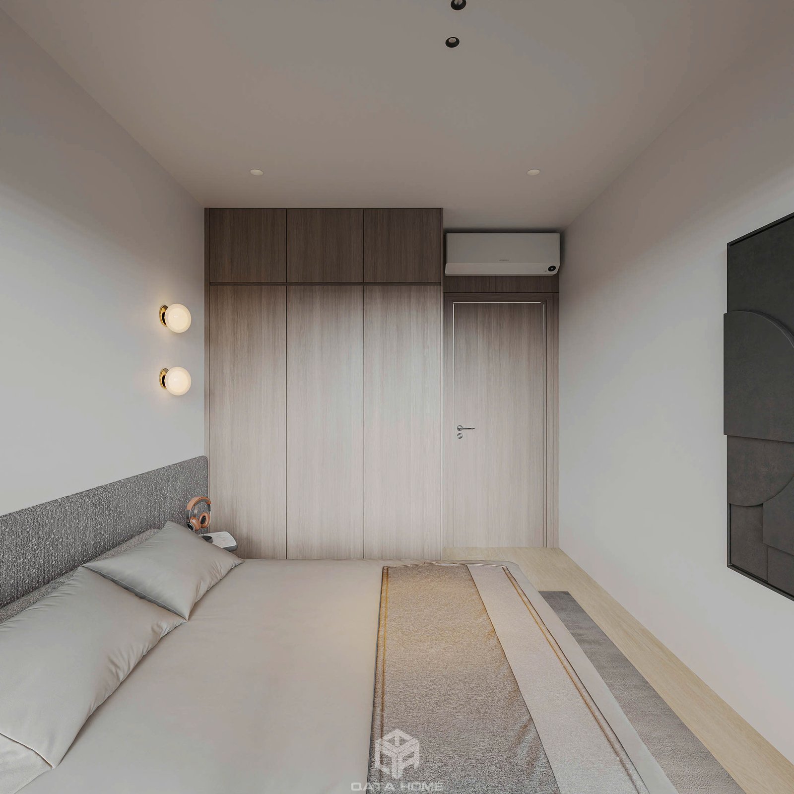Phòng ngủ master được Qata Home chăm chút với giường đầu giường da cam ấm áp, kết hợp tủ quần áo kính đen sang trọng và bàn làm việc tích hợp. Đèn sàn cao tầng và ánh sáng LED gián tiếp tạo cảm giác thư giãn tối đa.