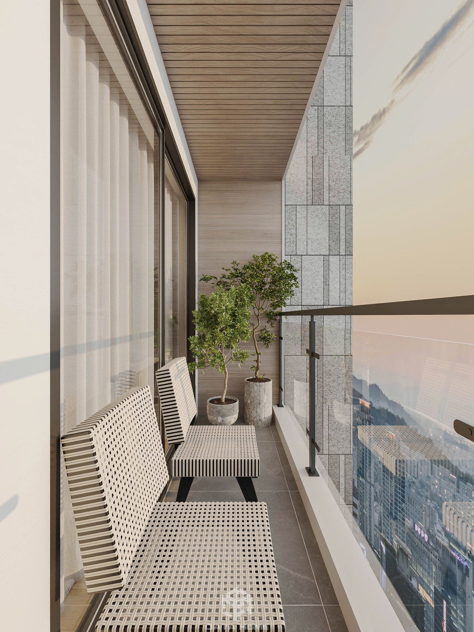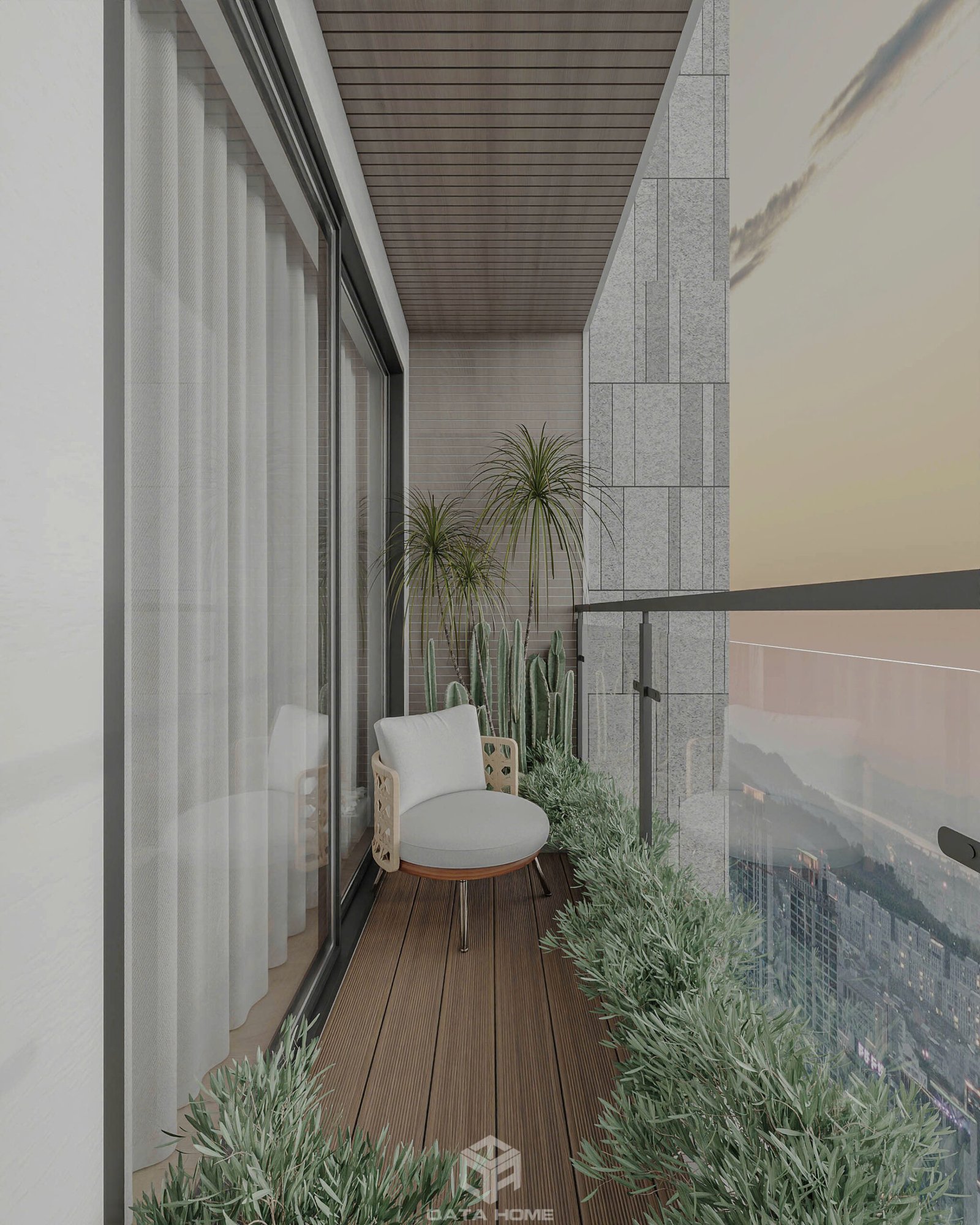 Một trong những điểm nhấn không thể bỏ qua của thiết kế nội thất Lumiere Boulevard chính là ban công. Qata Home thiết kế khu vực này như một “ốc đảo xanh” nhỏ với ghế ngồi đan lát hiện đại, cây cảnh bonsai và sàn gạch đá tự nhiên. Từ đây, bạn có thể ngắm trọn view thành phố lung linh về đêm hoặc hít thở không khí trong lành từ Vinhomes Grand Park.